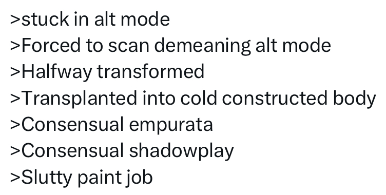 >>89858 >Henry creating FeMG to try and better play off the whims of the people >People like female-shaped drones better than male drones - hence, it's genius to make an enforcer who is both (1) better able to infiltrate and (2) still easily manipulated >With a little bit of scraped J data, paired with the most useful bits of MG's brain scans, the coding was complete >Cackling gleefully, Henry sends FeMG off on her first mission while MG watches in horror from the operating table >... >Some time passes, and FeMG has still not returned >What on earth could she be doing? >Henry flicks on the visual feed for a second before immediately flicking it back off >"B-boss?" >"... yes, MG?" >"What was she doing?" >"Take a guess." >Henry gets up, rubbing his eye, a pained expression on his face >"I need to laser etch that memory from my brain. We're officially pivoting to the APD program from now on." >Henry begins to leave, MG still strapped down, before turning and looking to his today disdainfully >"... why are you SUCH a prostitute though?" >With that, he leaves >MG is terrified (of FeMG making all the money first)