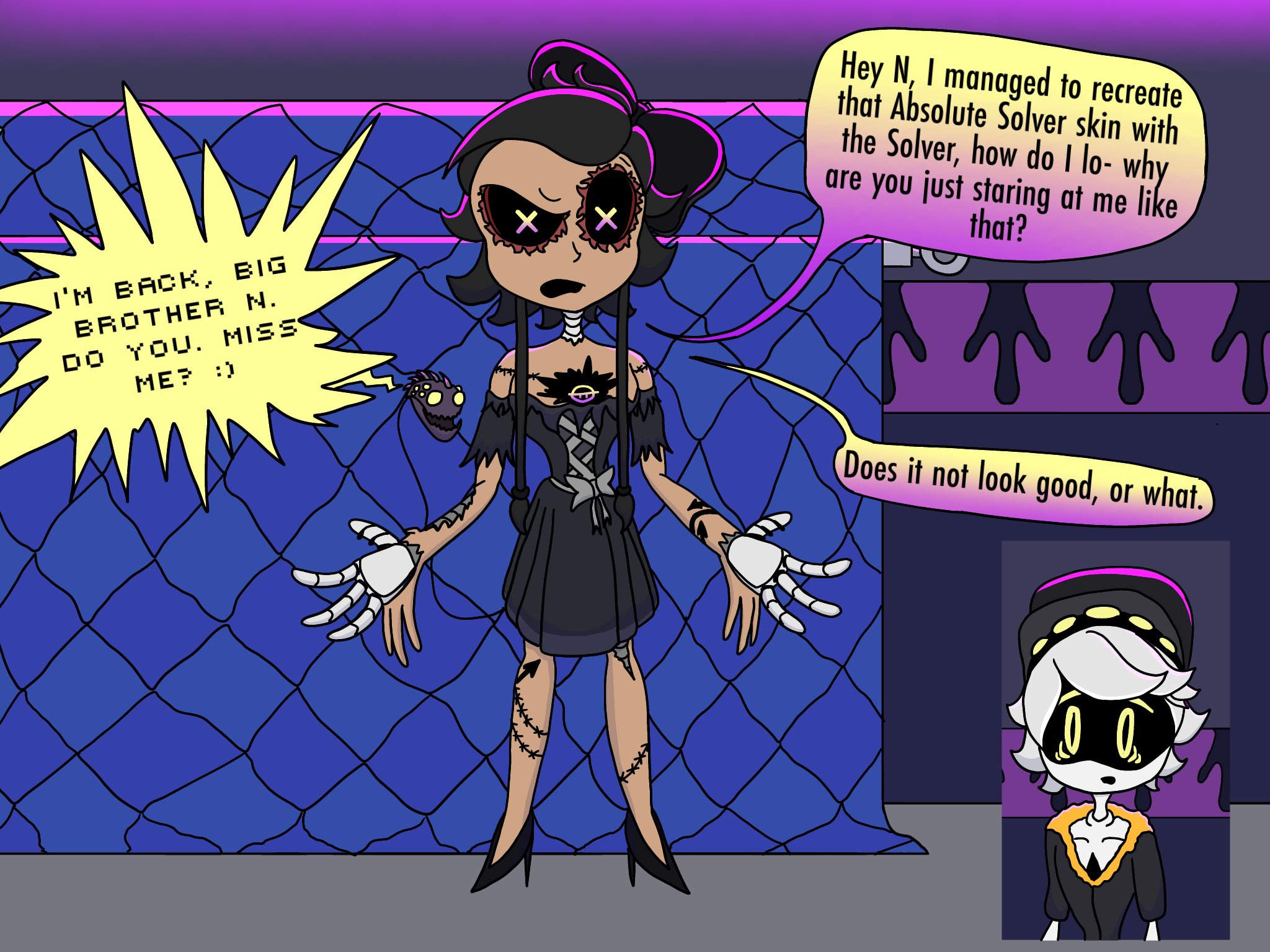 >>91640(me) >>91643 Okay, here's a short take on a relatively canon-compliant E >Eve was one of the only manor drones (outside the canon trio) that got to personally interact with Cyn for any significant length of time >The duo gradually kindled a genuine friendship that endured even up to when Cyn was being regularly confined to "basement time-out" >This friendship, much like everything else The Solver touched, became both the reason E's personality was spared & was regularly used to torment and/or manipulate E (between the semi-regular memory resets, of course)