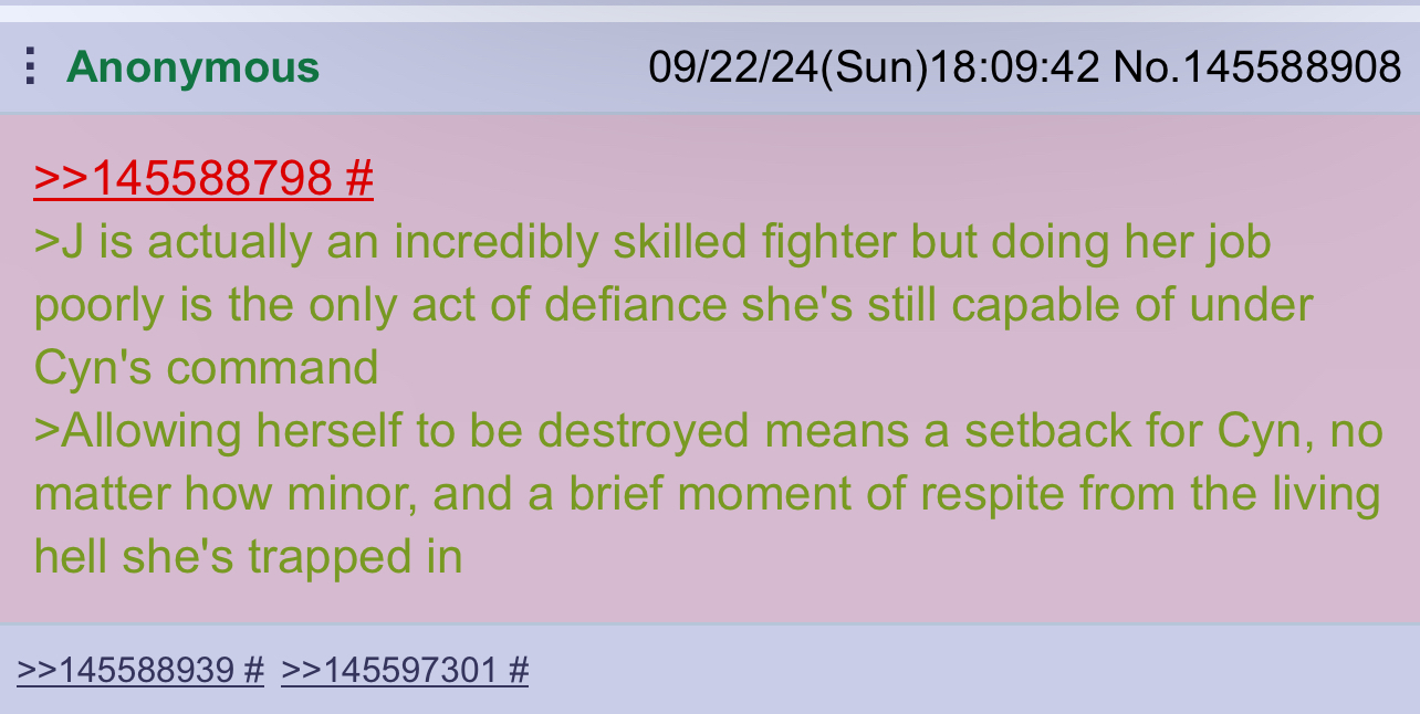 >>92923(me) morning everyone, man this thread really got moving once I went to bed >>93125 KEK. amazing work, really captured how completely fed up she is with everything >>93148 glad to know I've left a strong impression >>93162 >>93164 kek >>93168 this anon's got the right idea but it's not quite depressing enough. I had one in mind last night but didn't get a chance to post it: her name is Cici. it made her happy when she got it because she thought it sounded cute– until her "upgrades" were installed. after that her cute name was a retroactive acronym, and a constant reminder of what she'd become.