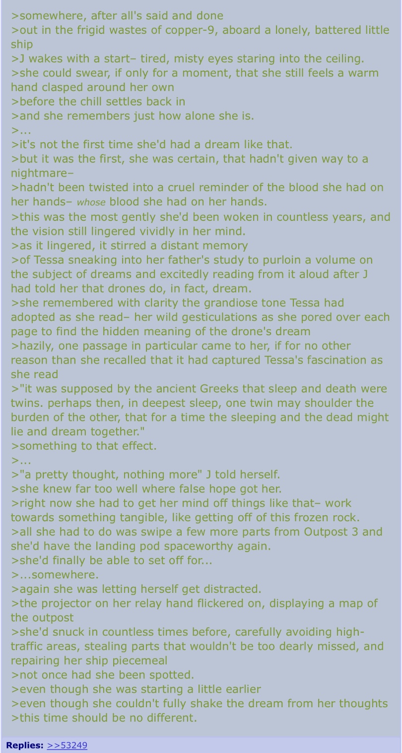 >>92979 >Negev has broken out. >After hundreds of appeals to her wranglers, she finally realized she would be stuck in those wraps forever. >With all the time at her disposal, she formulated a plan. >Wait until an orderly who she knew to be incredibly lazy came to feed or clean her. >Headbutt him twice to activate the standard JCJensen Worker Drone reboot knock code >Break through her straitjacket (which she could have done years earlier if she weren't under constant surveillance) >And climb into a vent and crawl toward one of the more unexplored areas of the colony to figure out where to go from there. >When the day came and the orderly entered, she immediately went to action. >Unfortunately, she had hit him one too many times, breaking his optics before he went into reboot. >That definitely wouldn't pose an issue later. >The rest of the plan went swimmingly, and now she sat in the VIP Cryobay hidden deep within the colony. >Now she waited. >Either for them to search for her, or for them to forget she even existed. Shoddy sleepy green, forgive the poor quality.