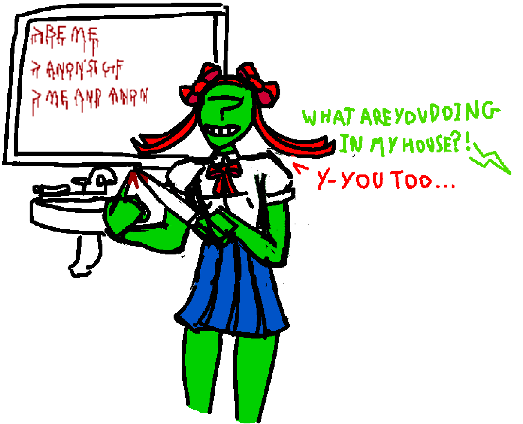 >>100075 >Back at Beretta's home, she looked at the thing that Jane asks her to take care of. >A Bugretta. >A small sausage-like creature that bears an eerie, if not cute, resemblance to her. >Just like the Oogies that her mom loathes or the Enns that her Auntie V likes to cuddle with, nobody knows where these come from or why they look like her family. >Doesn't matter to her >"Alright, let's see here." Beretta looked at the list Jane gave her. >"To-Do List for Boog <3", it says. It's rather short but detailed. >"Feeding with berries, bathing with soap, sleeping..." >"Seems easy enough. Might as well get this over with."