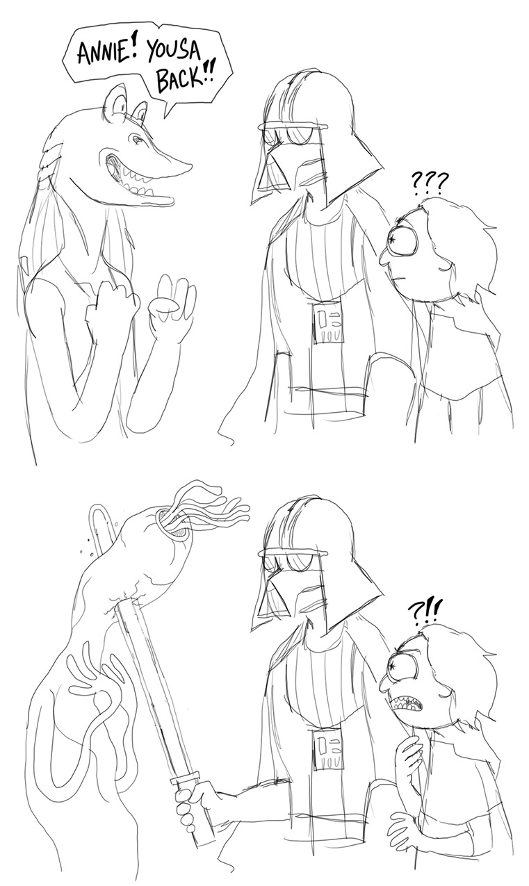 I think what annoys me the most is, I joked about the EU along with everyone else. Like anything that had gotten that big, it had some screwball and downright legendarily bad stories in it. When they announced everything became un-canon, all I could think was "Good! Finally we can get rid of stories like 'Han Solo's kid going Sith' and Chewbacca needlessly dying in an sad attempt to raise the stakes." But it also had a lot of great stories in it. And I thought the new movie would take the good parts of the EU and leave behind the bad. Instead it feels like we took the bad and left the good. And now people still make fun of the EU because it's an ingrained practice at this point, its reputation is tarnished beyond repair, but I can't help but wistfully remember the universe that gave me the Rogue Squadron series, Thrawn and Mara Jade, and even the misadventures of Tag & Bink.