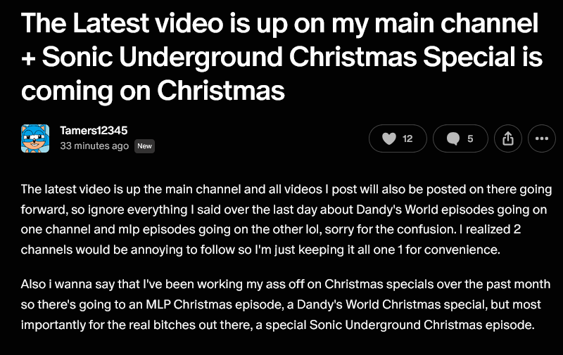 Welcome to /sssr/'s very own Sonic Underground thread! This thread is for posting links to Tamers' latest videos and for discussion between the 4chan threads. The occasional NSFW image is allowed provided you tag it as NSFW. Plus4chan supports posting webm & mp4 videos (with sound!), and unicode symbols in text: 🔵🔵👏