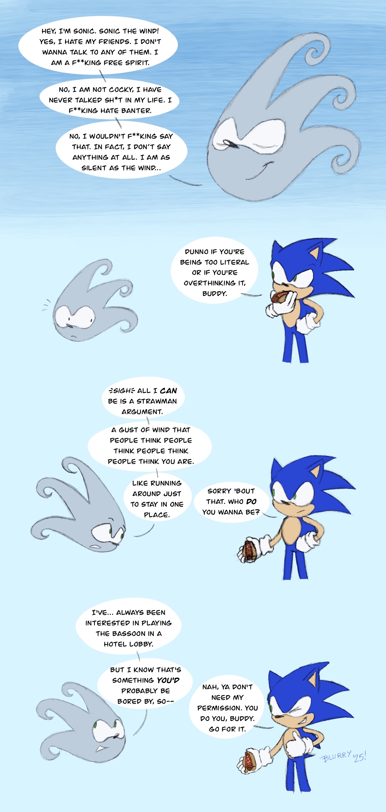 >>16334 Nice to see Rava get some attention. South Island was heavily implied to once be the home of an ancient bird civilization, hence the horned owl carvings so there's probably something lore-related to work with >>16345 I really should give that a read >I can't imagine doing a yearly Archie Ride. I can, and it horrifies me! >>16349 >spoiler Absolutely patrician taste! >>16351 Cute! I like that the more owl-like traits were retained while still going for the Mobian body shape >>16357 Shame it's not as lively as ours, although maybe that's a good thing >>16364 It's all so tiresome. Sonic was only face to face with Clutch for about one page (and hilariously, Clutch was able to side-step him) and the lack of any prior interaction between Sonic & Tails and Surge & Kit was a travesty. Imagine if Sonic and Scourge only ever had one (let down of a) fight despite building up to it for years. Absolutely ridiculous! >>16365 I'd certainly get a lot more use out of the villains if I were writing. Clutch would be Renfield and mostly go against the Chaotix, Rough and Tumble would still be comedic relief villains, but would go up against new OC heroes like Tangle, Mimic is absolutely perfect so I'd just feature him more, and I'd have gay duck revive himself using a perfected version of Surge and Kit's augmentations. We need more vlogging! >>16376 100% this! >>16394 He certainly knows how to get his point across, whether you like it or not!