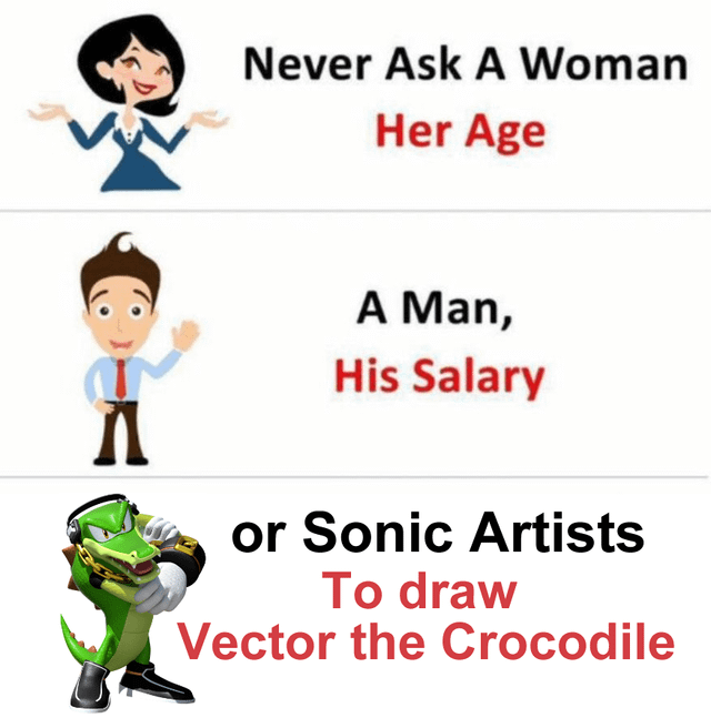 >>21163 >Yeah, postboot got some great interactions with them and I could see that becoming grumpy friends that can vent about Sonic and Rouge's antics >Vector: Mysterious pasts. >Relic: Genetically altered. >Julie-Su: Teased by friends. >Espio: Incredibly stubborn. >Knuckles & Shadow punch each other, getting cross countered. >Charmy: You'd think they would like each other. Also 5 on Shadow. >Mighty: Charmy! Also, yeah 5 on Shadow. >Omega: TEN ON THE GUARDIAN.