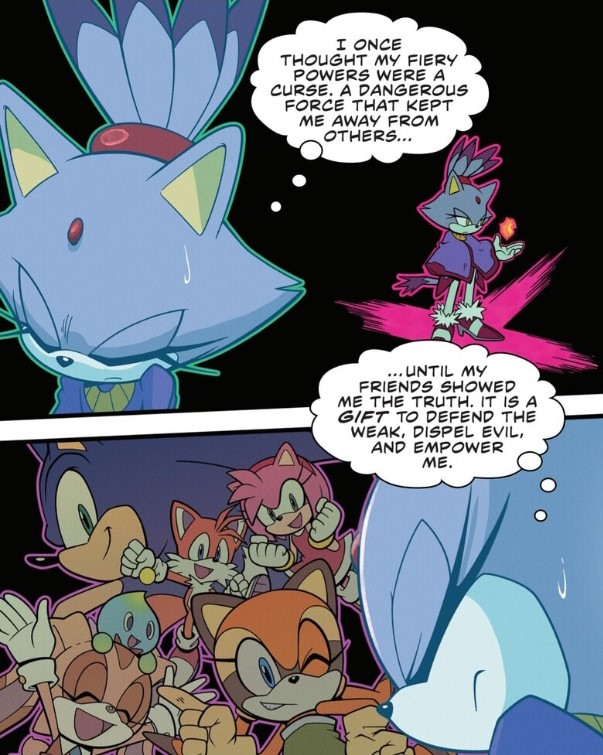 We’re now in the present time and not only is Gold here with Blaze but they seem to be quite close! Also, Blaze has a personality like her name would suggest. Maybe this is what happens when she has someone that encourages her to be more emotional and helps her control her power. Who knows what kind of adventures these two get into in this alternate universe!