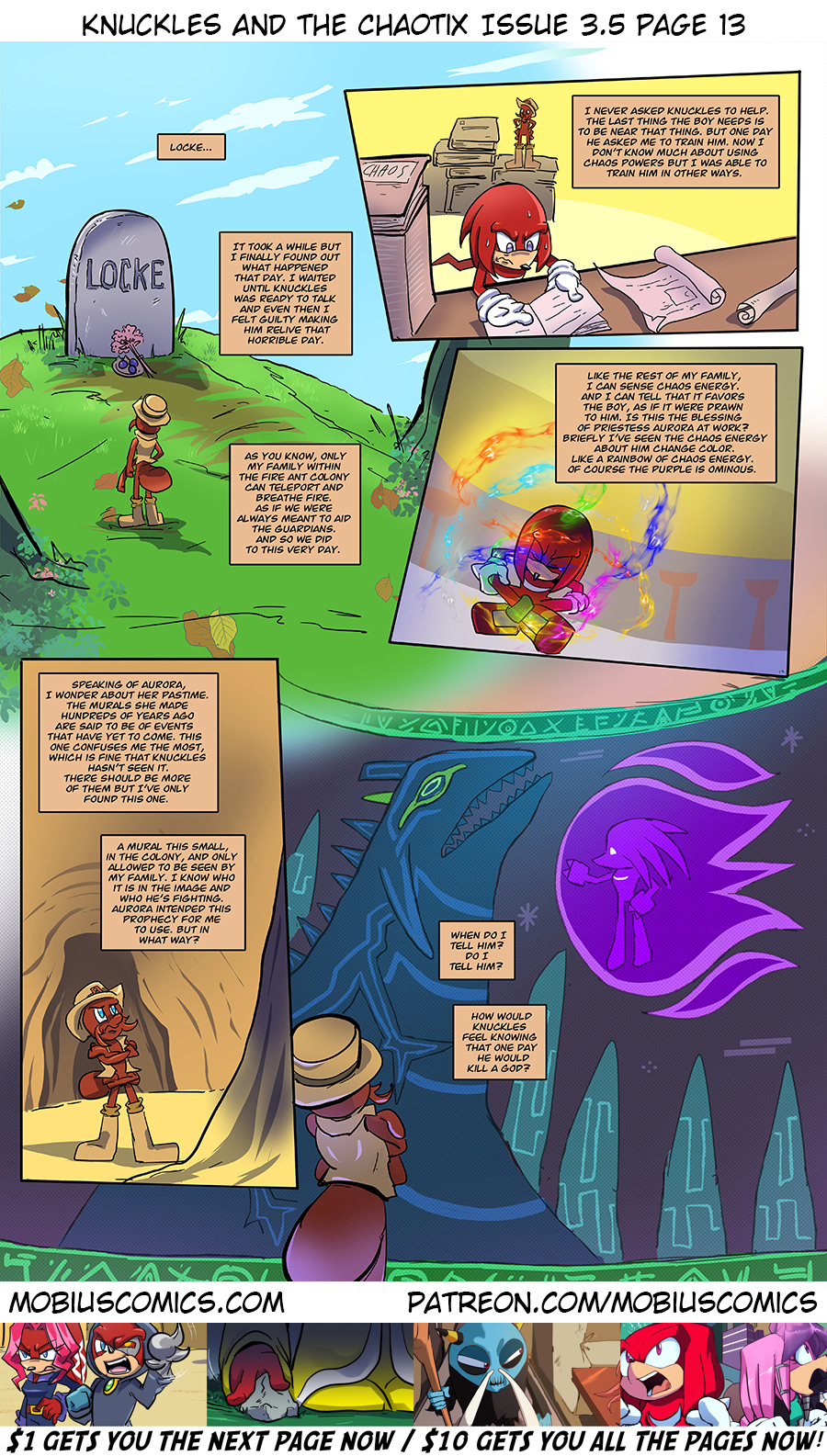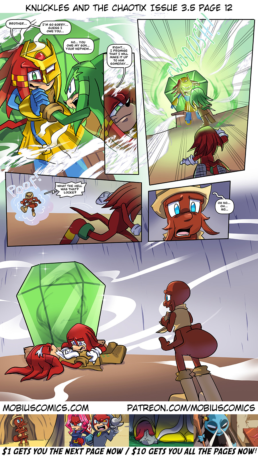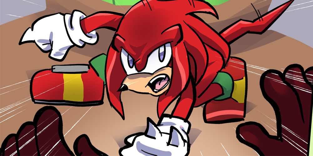 Penders: Locke dies from cancer when Knuckles is older. Ian: Locke dies more recently by sacrificing himself to save Knuckles. Me: Locke dies by sealing his corrupted brother in the Master Emerald in front of Knuckles when he’s just a child.