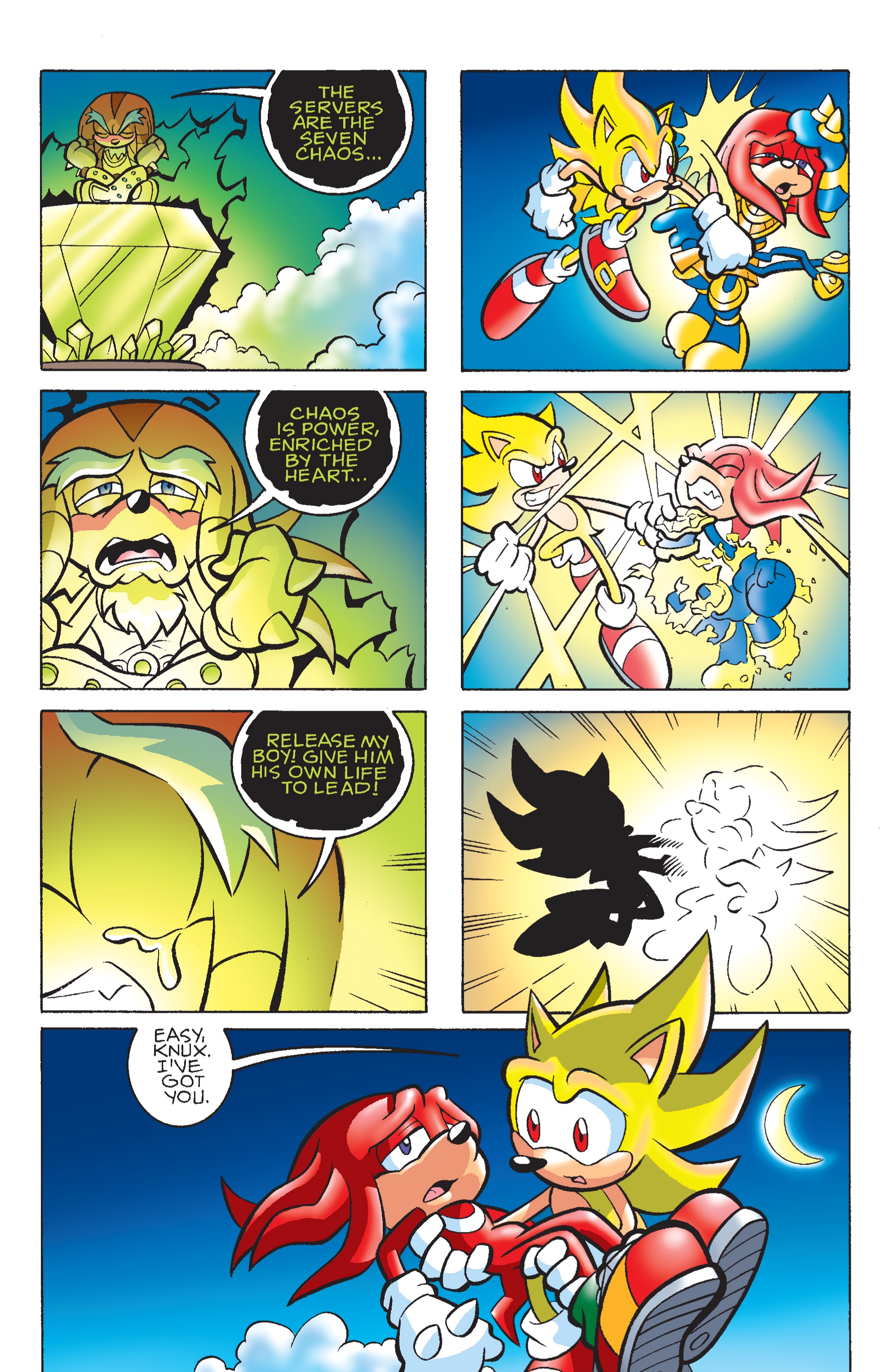Thanks to that little bit of resistance from Dimitri to slow down Enerjak, Chaos Locke is ready to save his son! Receiving power directly from the Master Emerald is not recommended but desperate times call for desperate measures.