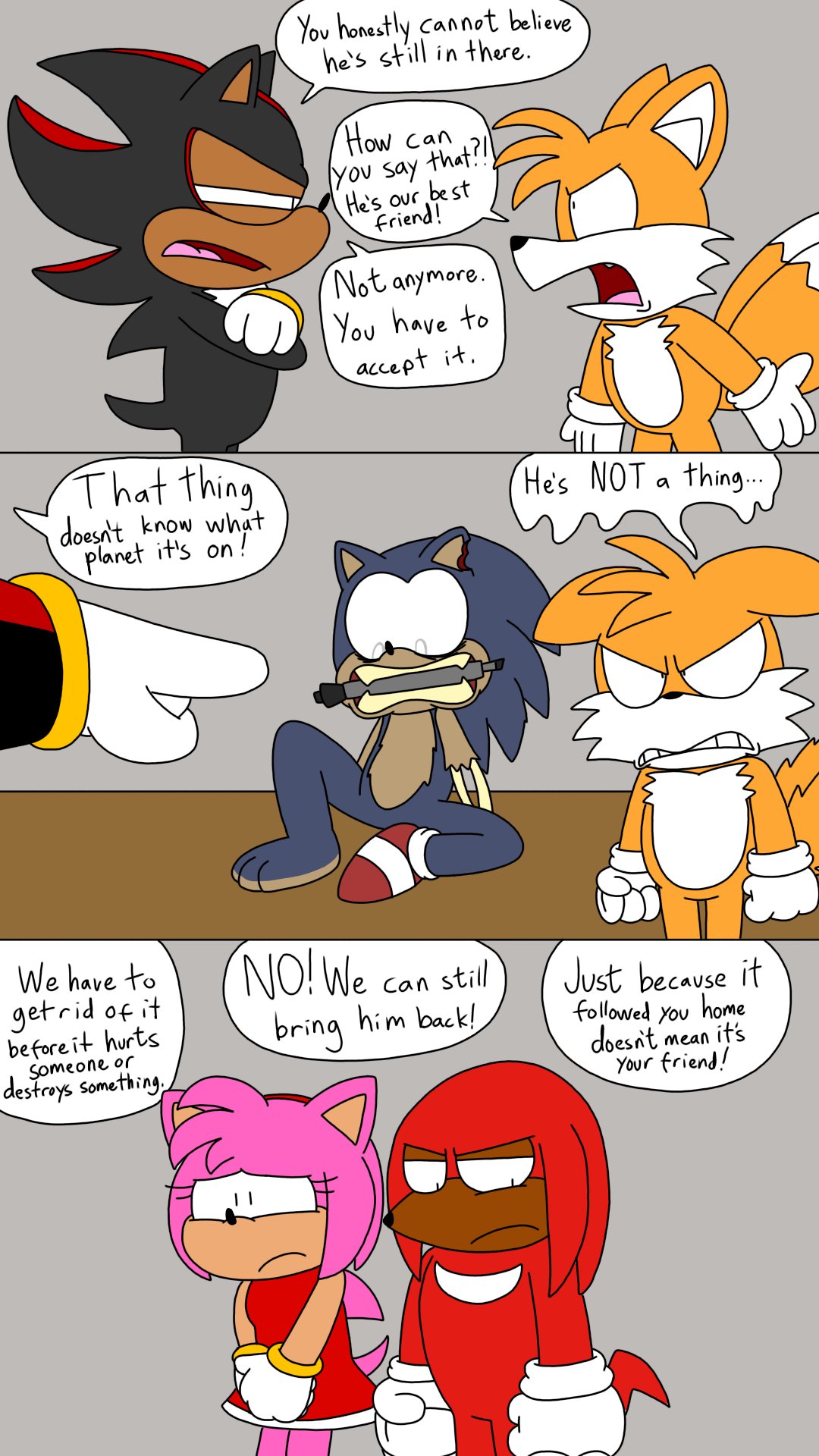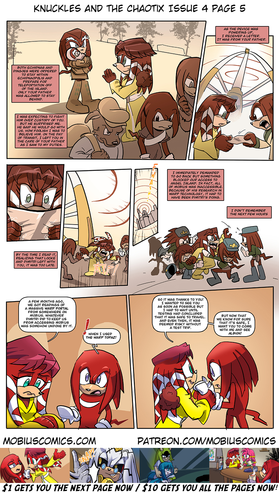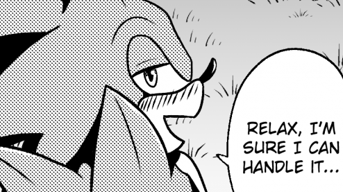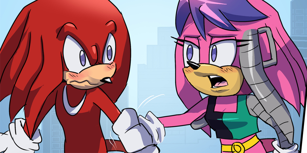 Knuckles is flustered in panel #4 because only Sonic is allowed to hold him like that.