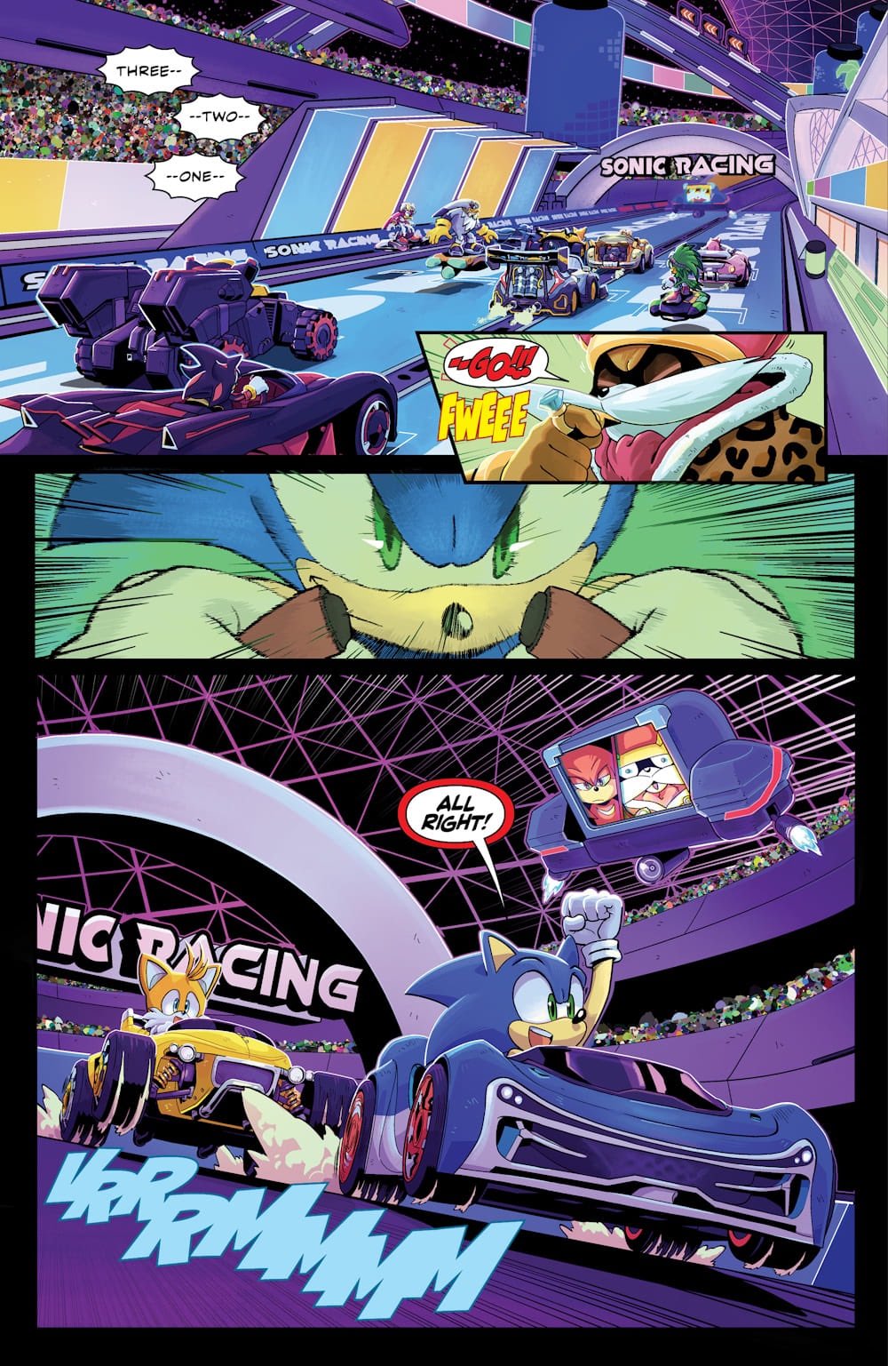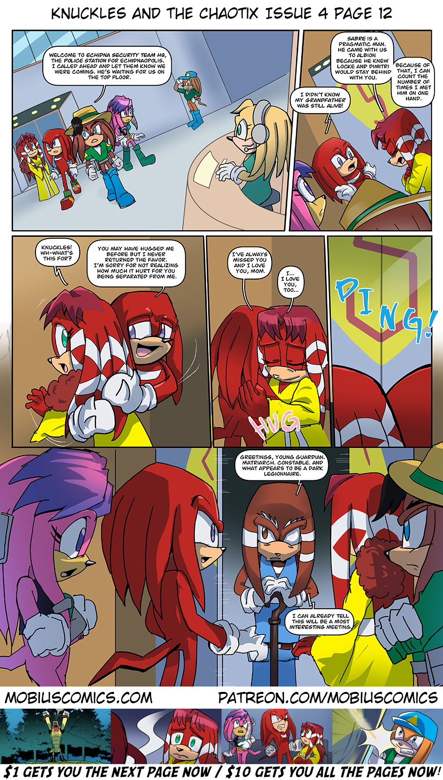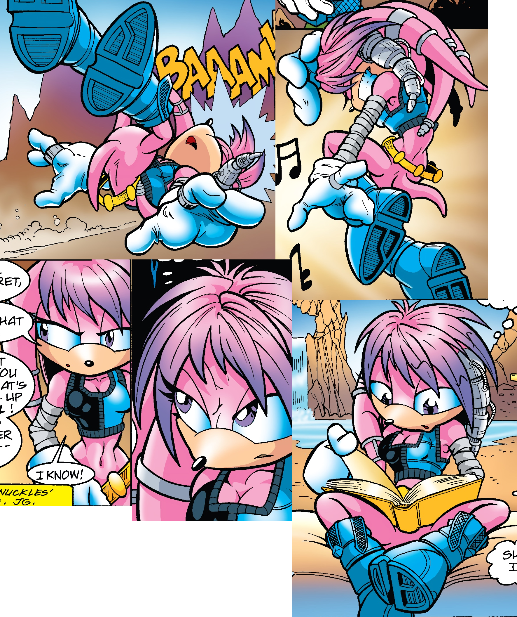 Knuckles is flustered in panel #4 because only Sonic is allowed to hold him like that.