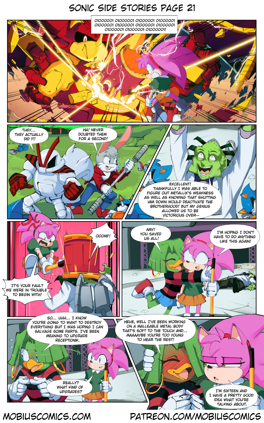 This little story is now wrapped up! I never intended to focus more than a few pages on it. The Metallix Brotherhood has been dealt with, Grimer’s going back to jail, Amy had her little adventure, and Tekno’s going to upgrade her robot girlfriend! We’ll see Amy again in Sonic issue 11!