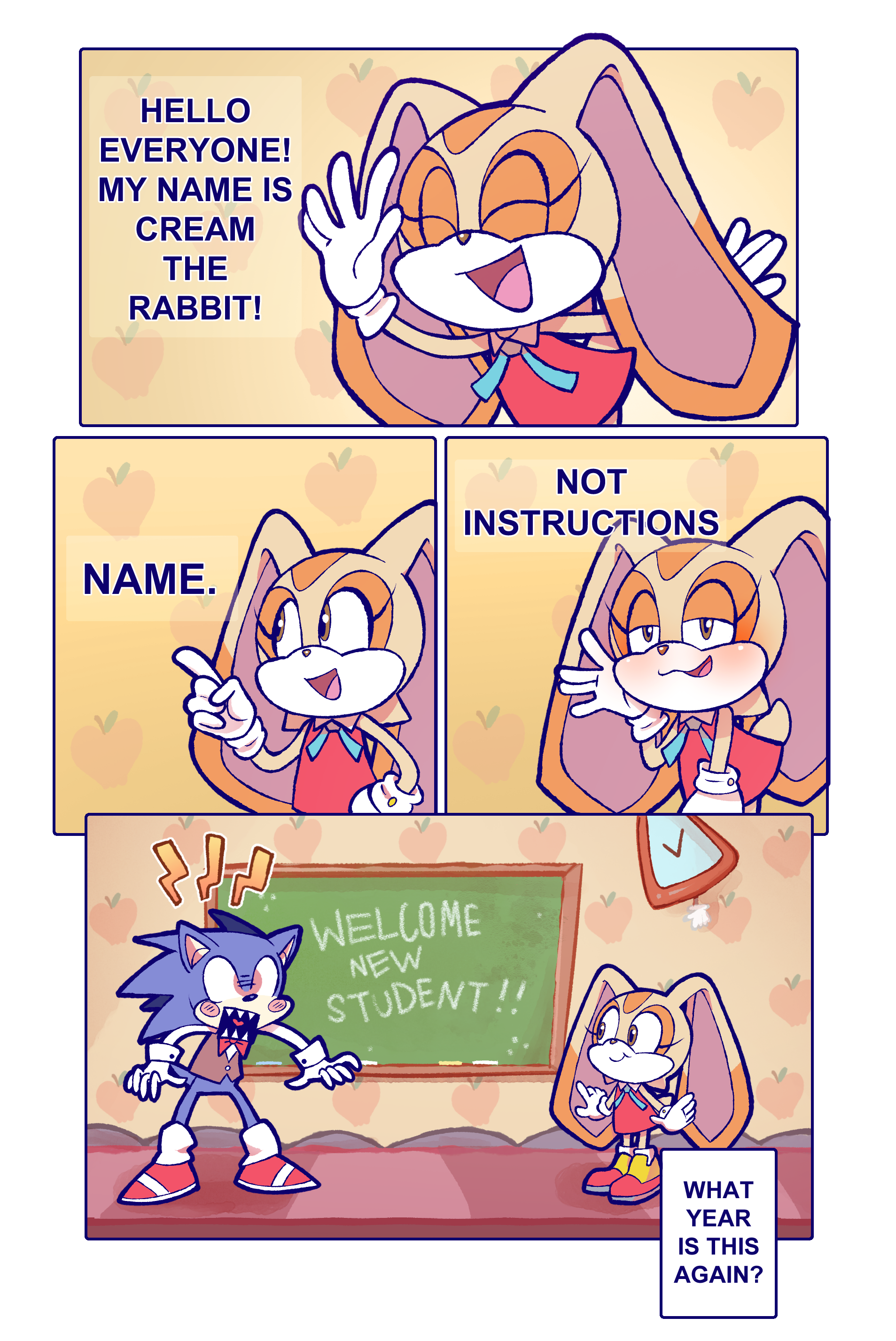 >>23864 I've been thinking about why people get so weird about their ages my guess is it comes down to character stylization making things ambiguous (Sonic and Vector look the same age despite Vector being "20" to Sonic's "15"), inconsistent roles (Tails lives independently and goes on his own adventures while Cream and Charmy require adult supervision despite all being "8"), and Sonic Team changing their ages (is Sonic 15 or 16? Is Amy 8 or 12? What about Boom?)