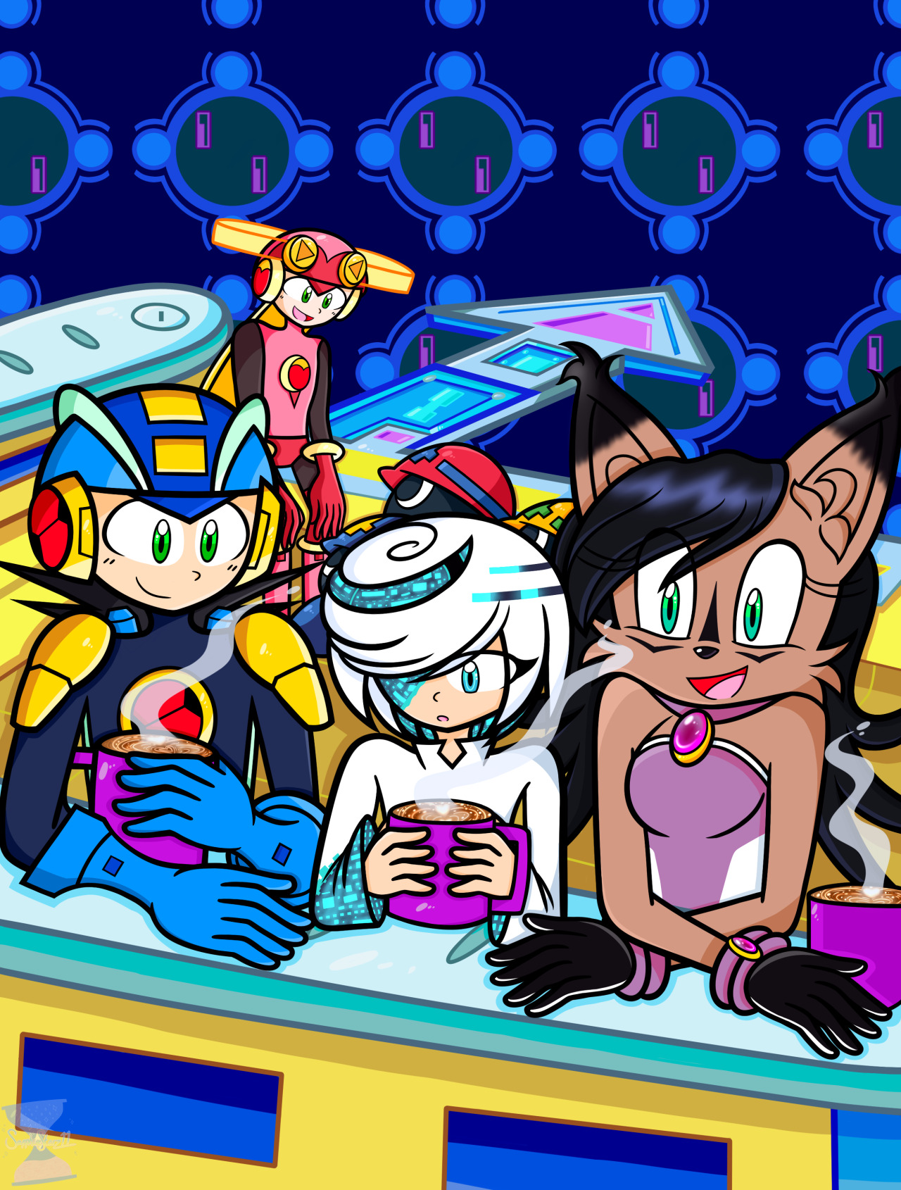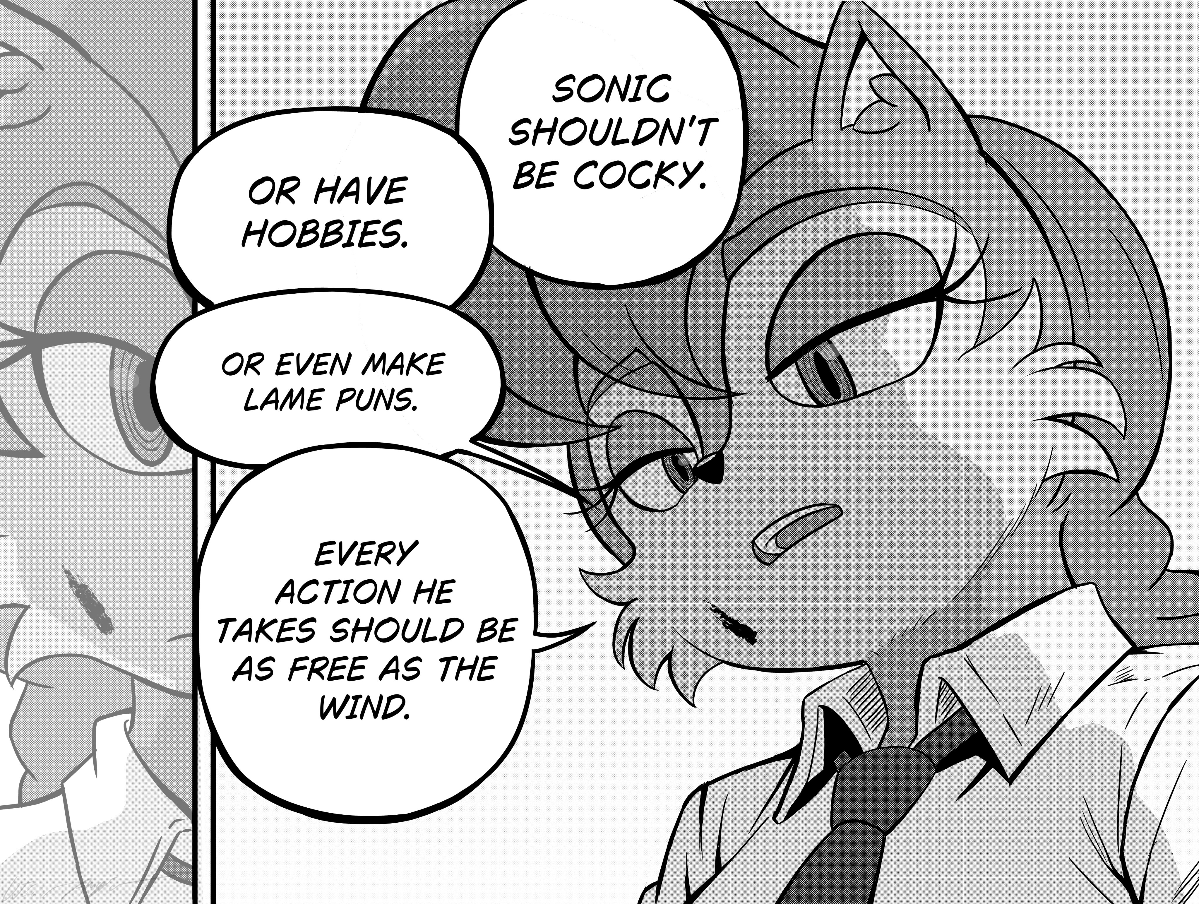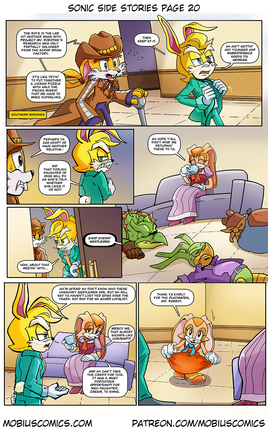 This was originally only a talk between Bunnie’s father, currently unnamed, and uncle, Beauregard. But I realized that nobody was going to be interested in just them so I cut and condensed most of their dialogue and added in two more characters! One thing that had been briefly brought up in the Archie comics was the hostility between the Acorn Kingdom and the Southern Baronies. There’s a lot of political stuff and there are wikis that go over it. All you need to know is that the two were not on the best of terms. The Southern Baronies is not only where Bunnie came from but also Vanilla and Cream, hence their Southern drawl. And there seems to be more to them than just that! Maybe we’ll check in on them earlier than intended in the future but this is the setup for the Hostile Takeover arc! It’s a ways off but it’s a doozy!