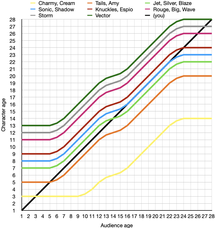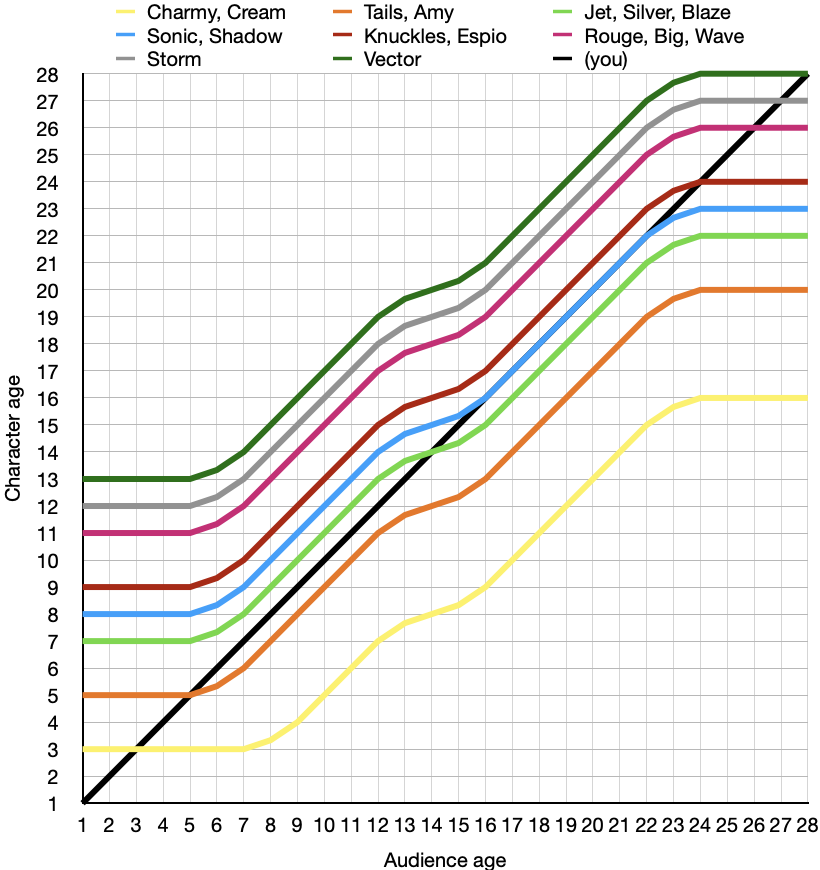 To wit! I have developed pic related, the last (and 100% canon) word on the Sonic age dilemma! As you can see, Sonic's age now matches people's (i.e., my) expectations. As the main character, Sonic's age is the only one that matters, with everyone else's age being relative to his (Knuckles isn't 16, he's slightly older than Sonic, Amy isn't 13 but a few years younger, etc, etc). With this, we can finally see why some people get so weird about their ages. For some 15-20 year olds as well as those with arrested development, they see a character 3 years younger than them being sexualized and it gives them the ick