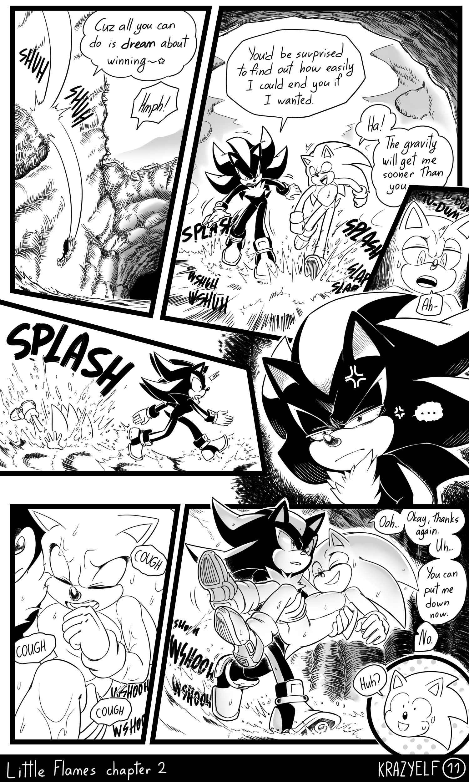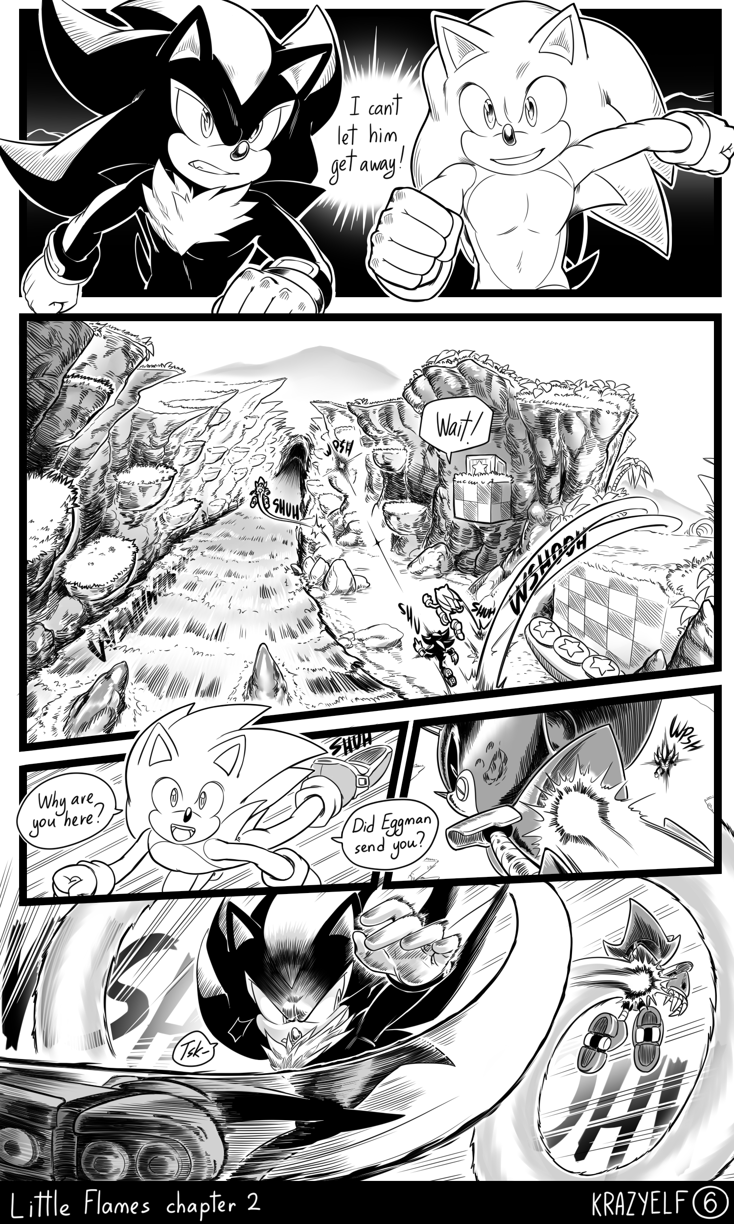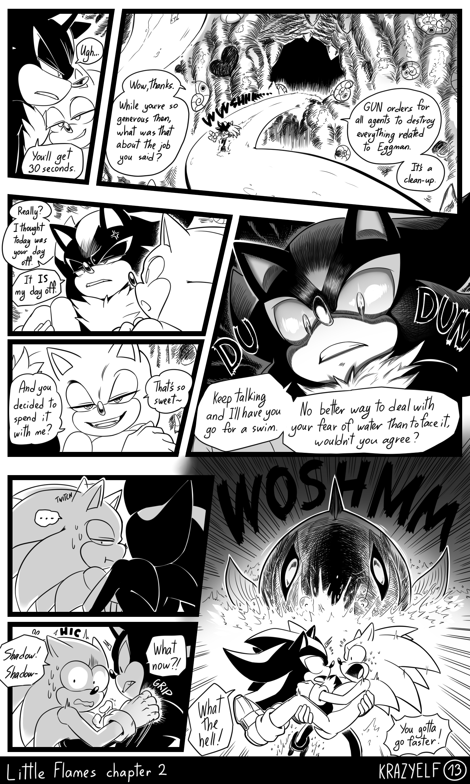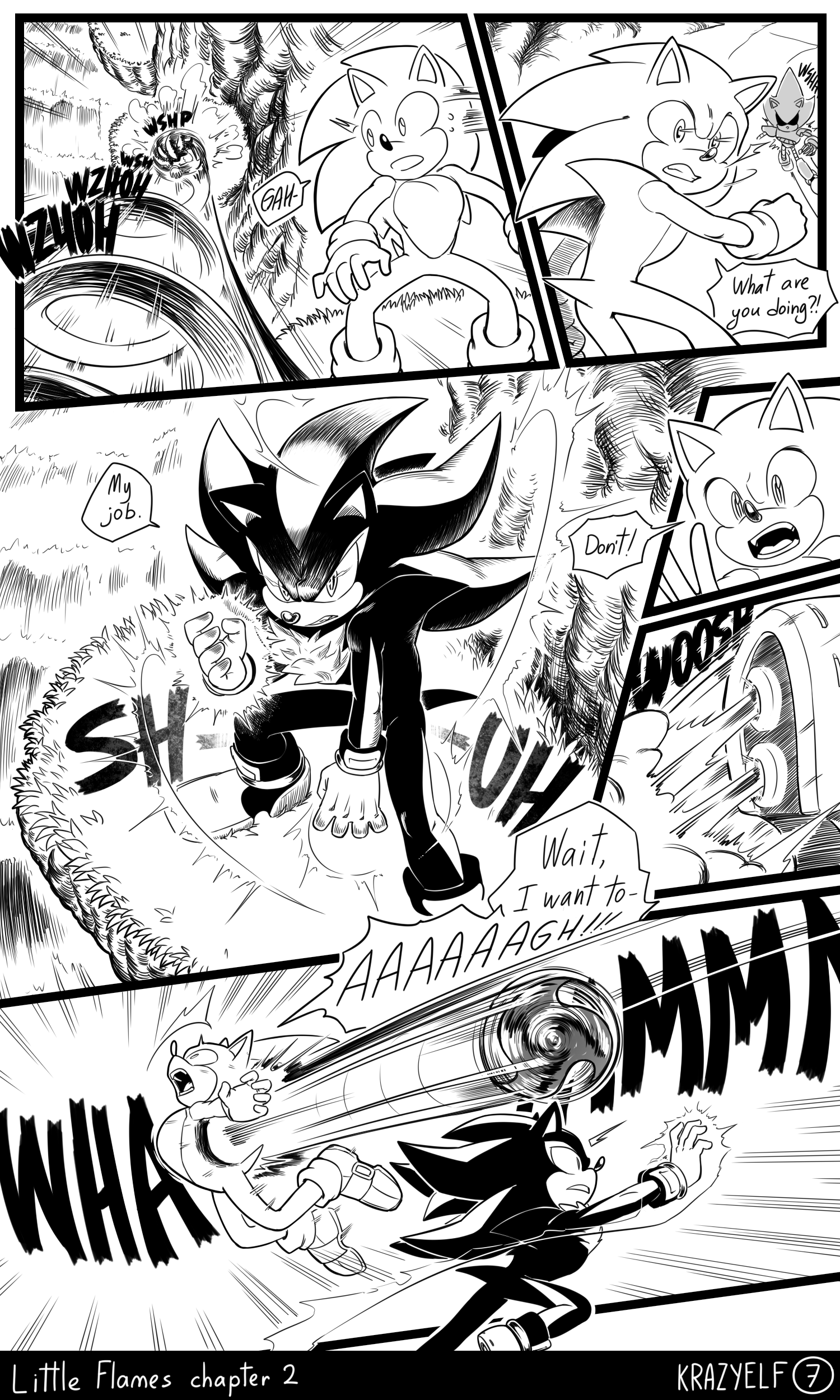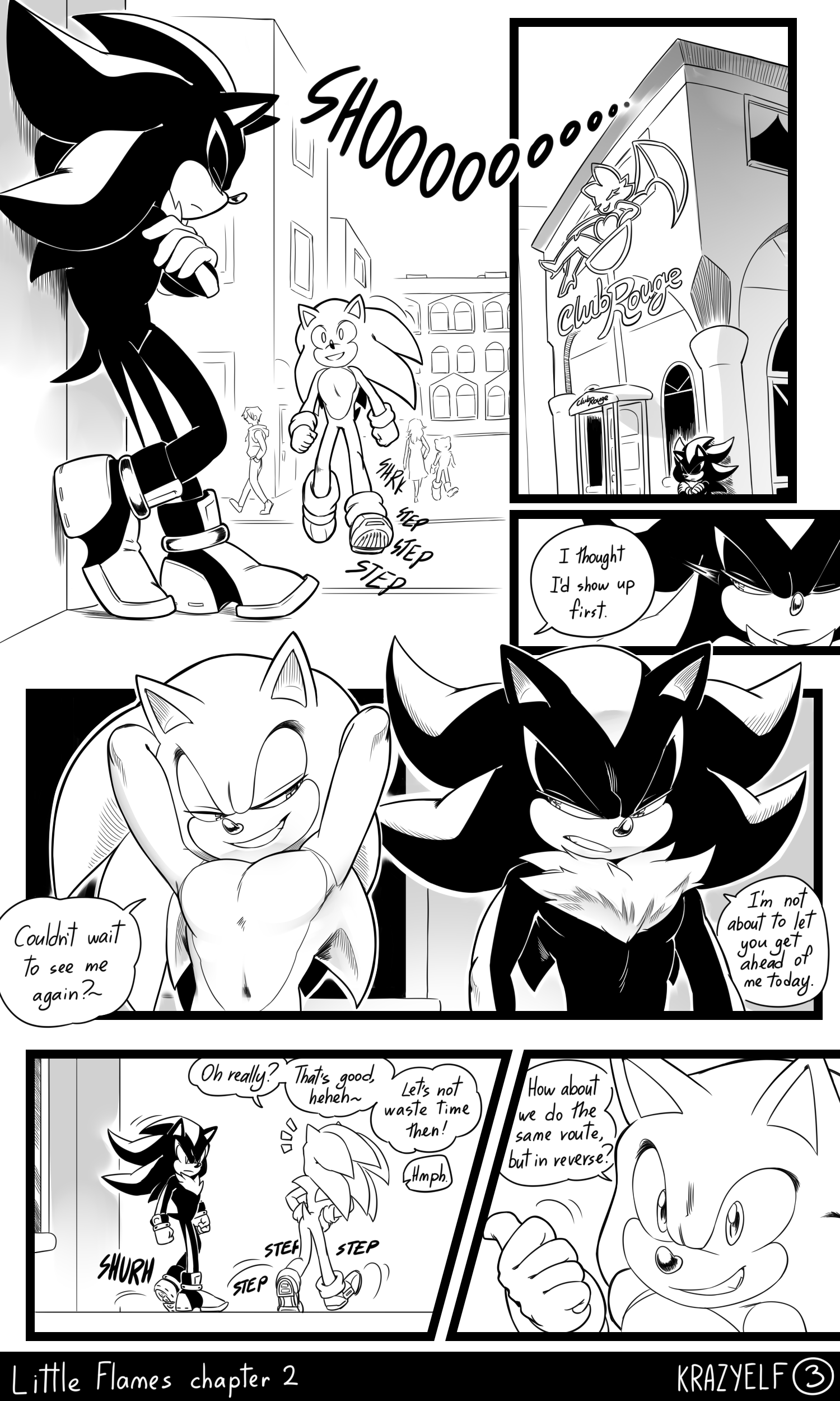 Another chapter in Little Flames, the gayest not-yet-gay comic is here! (Is this gayer than Heart of a Monster? You decide!) With Eggman dead, Shadow is worked to the bone by GUN and Sonic is feeling restless. Does Shadow have enough energy for Sonic? How about Sonic and a couple of other threats? Let’s find out!