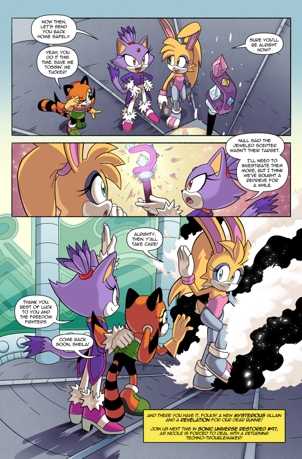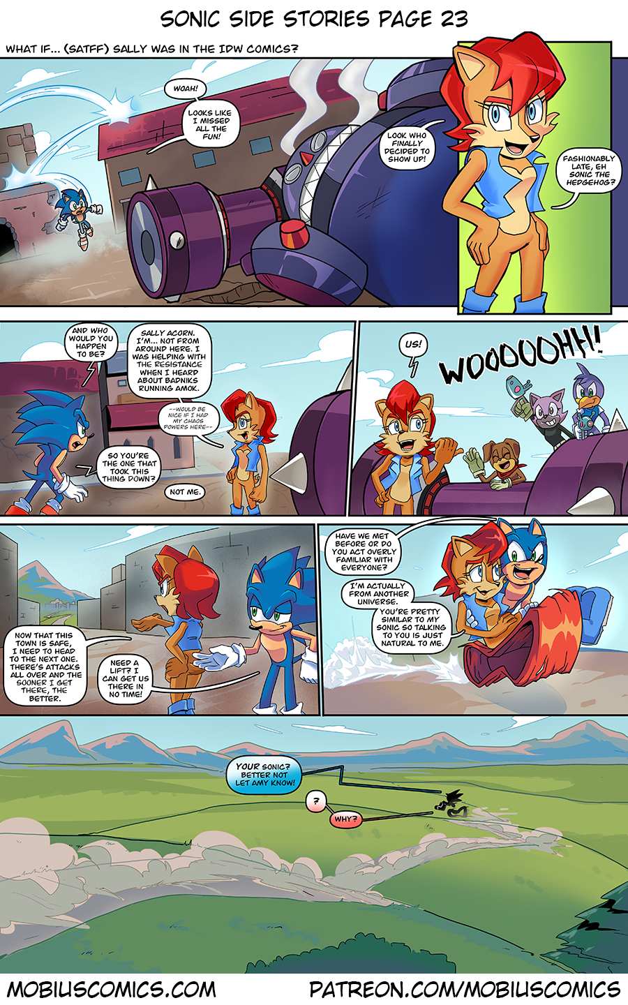 First part in what could be a non-canon(?) Sonic Side Story series called Sally in IDW! What happens when Sally finds herself in the IDW comics? How will she affect the series as it progresses? To keep things fair, she can’t use any chaos powers so she’s more like the original Sally. Will this Sonic fall for her? Sega wouldn’t like that! And even if he did, nothing would happen. She’s got her own Sonic and one is more than enough for her. What happens next? Maybe we’ll find out in the future!