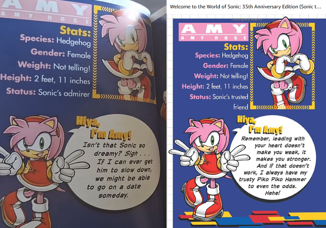 The 35th anniversary version of the "Welcome to the World of Sonic" book was changed from the 2021 version to completely remove all of Amy's feelings for Sonic