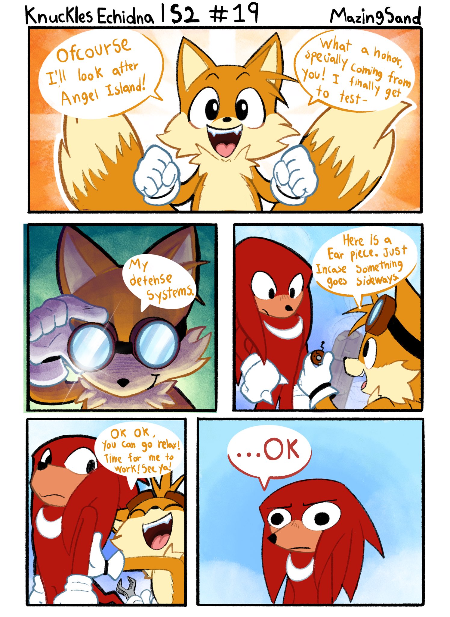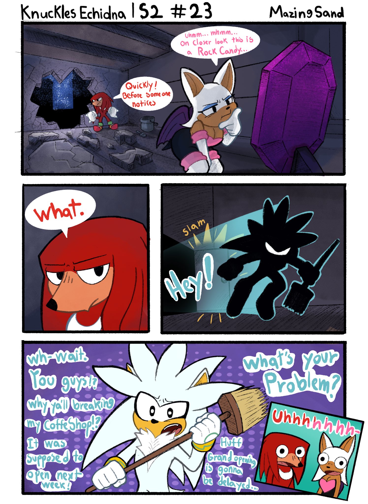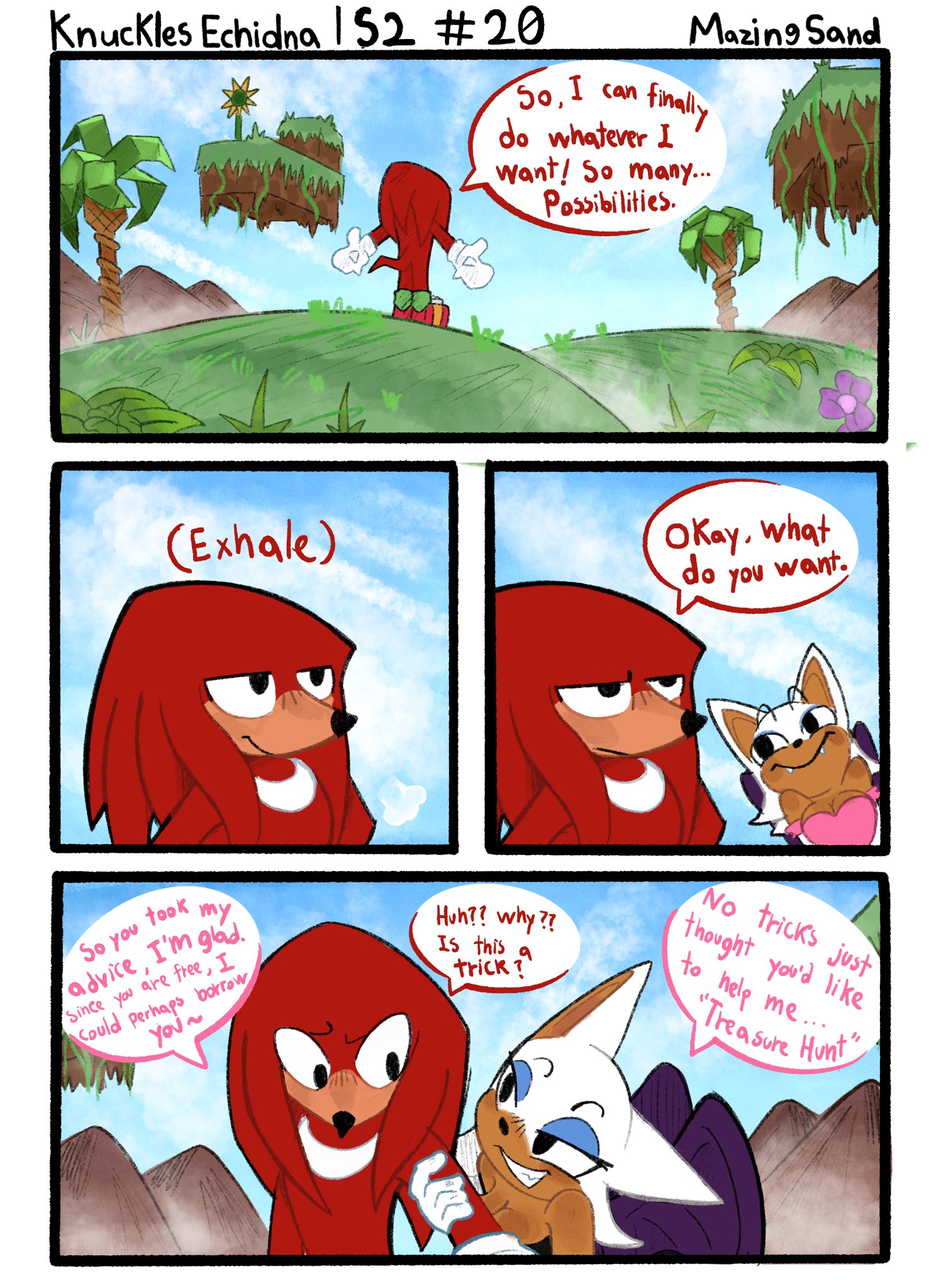One of the many, many comics I covered on the Unofficial Ride has two new comics! It's Knuckles Echidna! Previous comics: https://desuarchive.org/co/thread/134545928/#134546197 Webtoons: https://www.webtoons.com/en/canvas/knuckles-echidna/list?title_no=781905 Artist TwiX: https://twitter.com/MazingSand
