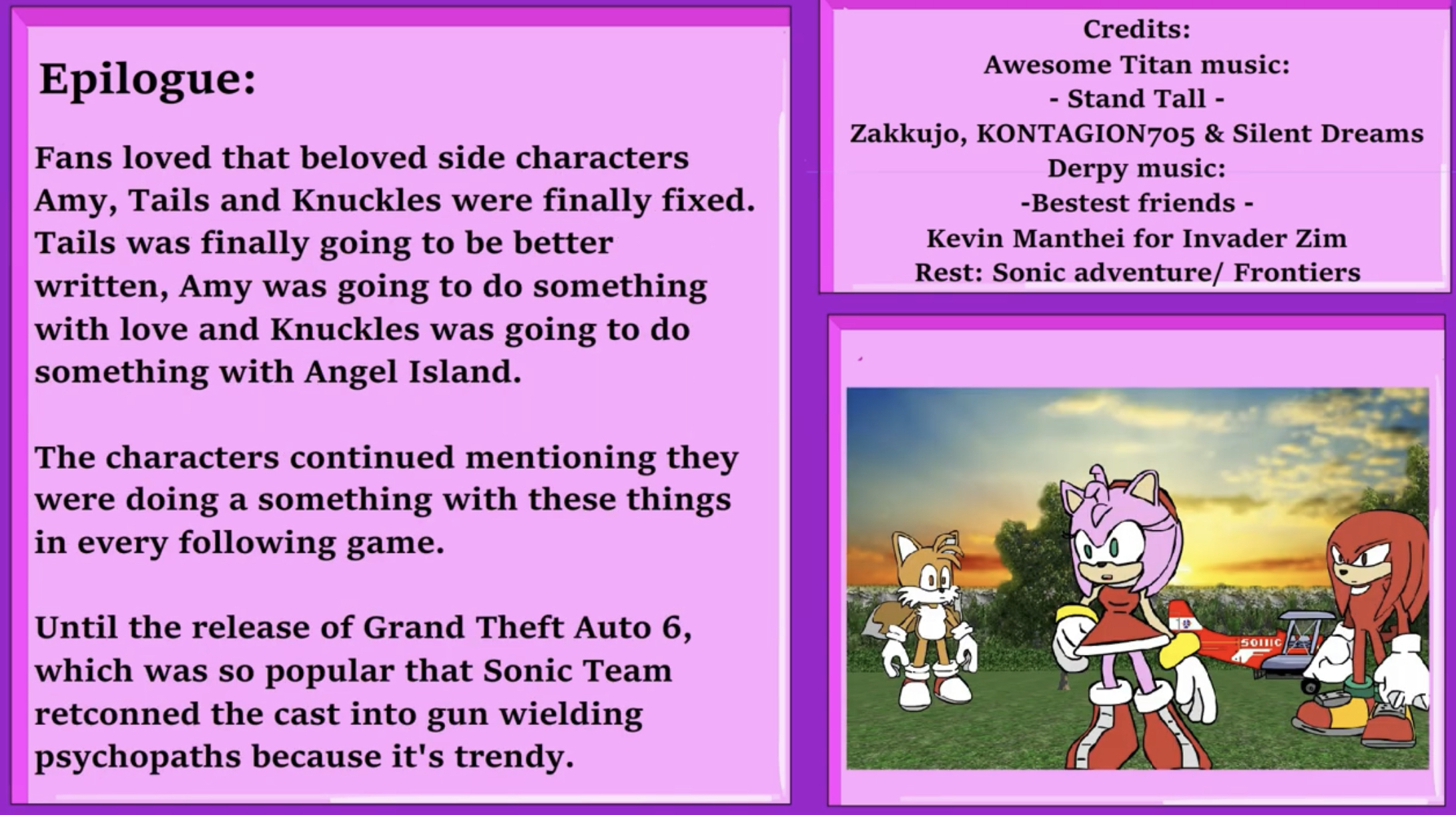 For Sonic X I'd recommend watching in Japanese since Sonic swears in that one and the plots aren't butchered by 4kids. If you find it boring, you can just skip ahead to the game adaption episodes since they flesh out SA2's storyline under Sonic Team's supervision. Oh, and there's Tamers12345's continuation of Sonic Underground, which is this bizarre mix of Always Sunny, the Venture Bros, and Newgrounds animations. It's not for everyone, but it's unironically one of my favorite shows.