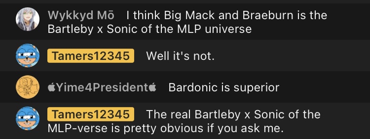 New Tamers thread: https://boards.4chan.org/mlp/thread/41339090 https://desuarchive.org/mlp/thread/41339090 >>7549 >I really hope we get a creditless version of the ending. The animation is so cool! My prayers have been answered!!! My Little Pony Ending: Delusional *Creditless* >>7613 lmao, he really does have that fancy villainess energy! >>7616 I don't know if I should be proud or worried I immediately knew he was talking about pic related >and we all know what that reason is lmao. Fun fact: he's drawn Bartleby as Batman and Sonic as Robin a few times >>7651 Tamers takes a Tolkien-esque approach to his work, where it's more like he's a historian or documentarian putting together various sources into a cohesive narrative than a fiction writer. He has theories on what the characters are thinking and what they will do next, but he's as much in the dark as we are >that gif Absolutely adorable! >>7675 Words to live by in these trying times