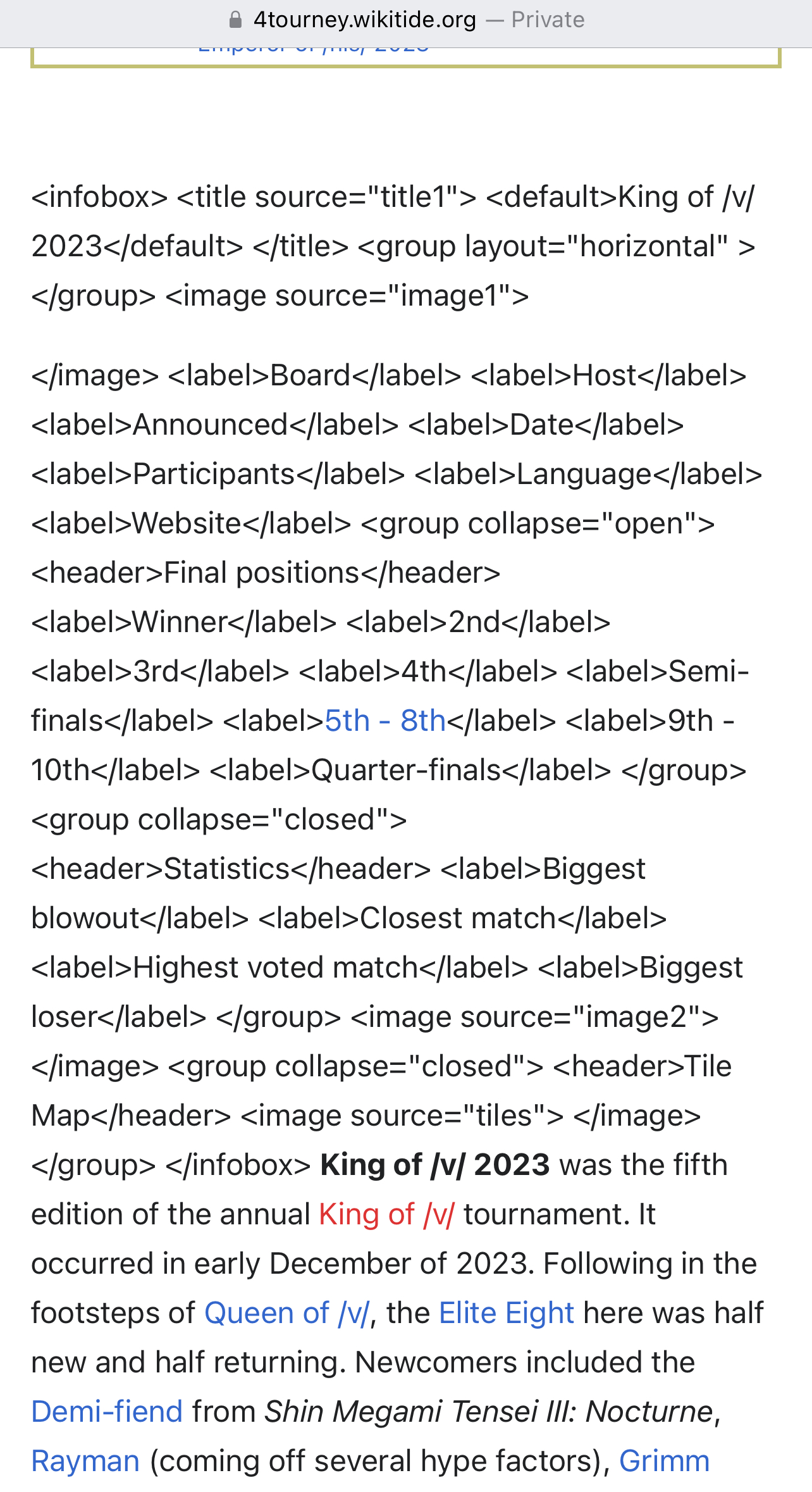 Thread for discussing the wiki. Booru discussion also welcome. The wiki is currently hosted at https://4tourney.wikitide.org/