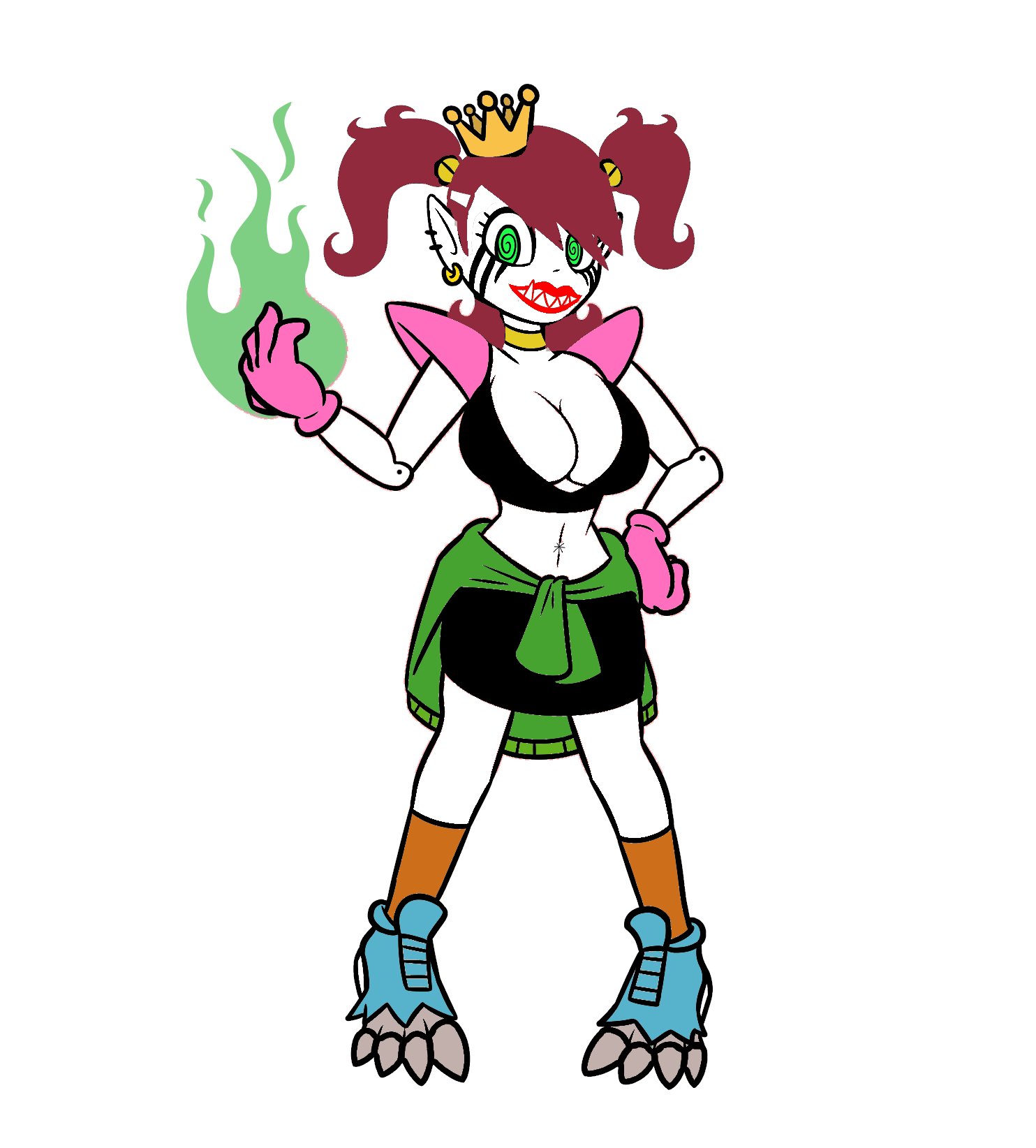 Torso is by far the hardest to figure out as we don't have earlier designs. Asterix bellybutton is a Spinel riff, Shoulder blades are mostly Spinel with a bit of Jenny influence boxing them out. Breasts are mostly Miss Monarch with a touch of Betty Boop influence. Actual human skin would be Miss Monarch and Betty Boop combined for 2022 since those are the only humans(Fang is the boots, and Jenny/Spinel's influence is in the enhancements) so pale, but not solid white outside the face which is Spinel and Fang influenced. Skirt is Betty Boops, but with a crop top showing her navel thanks to Jenny influence, Legs are Betty+Monarch influence.