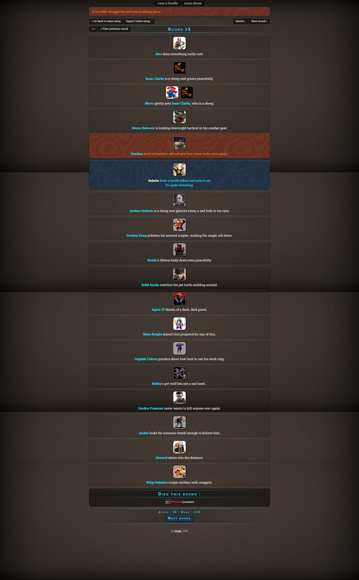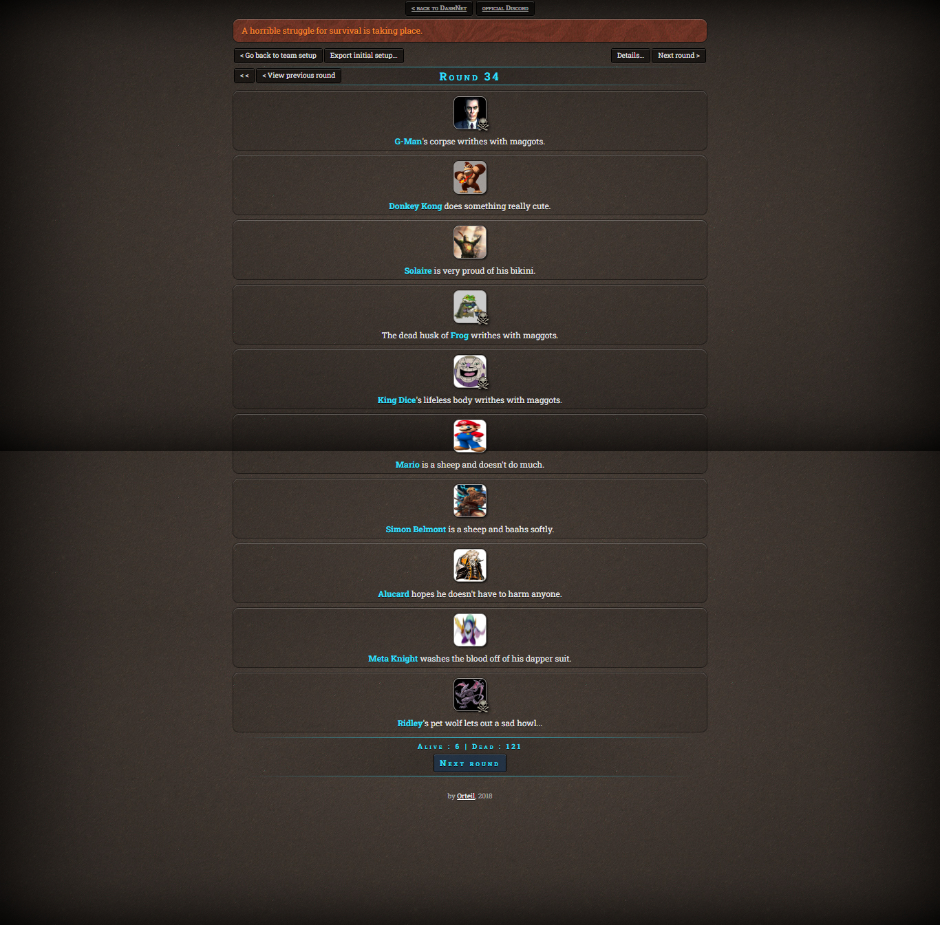 Welcome all to the Murder Games! The purpose of this tournament is to give any of your nominee a second chance to get a win. For each character added to this tournament, the game randomly gives them perks and items that will come in handy, although other times can backfire horribly. The game is simple, everything is a simulation where all the characters fight each other to death. The rules are simple: