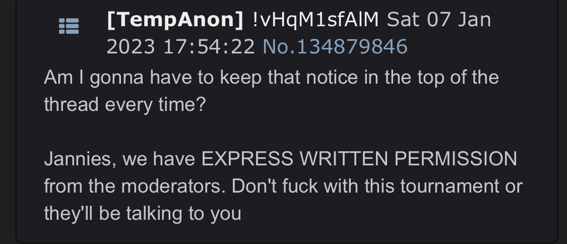 >Could have had a comfy /tnt/ tournament instead of trying to force it on the main board like we warned Tempanon and Psyanon