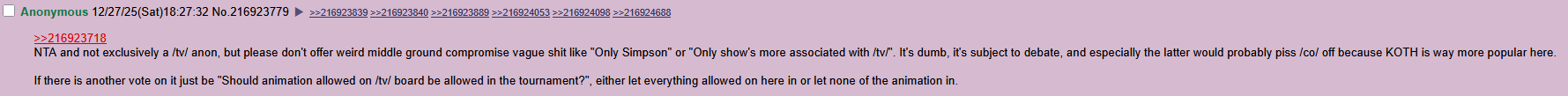 At the same time, besides those, animation will be filler because they already have /co/ (and I don’t think /tv/ will go for anime either) and will be brought up as such, so it should be a very condensed list of only the most well known animation characters and /tv/ memed characters