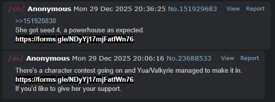 This board is for hosting tournaments and other organized competitions, be it either events, contests, or anything where a winner must be determined through votes or otherwise. Just for this board, image duplicates are enabled and the bump limits are set extra high. Roleplaying is encouraged, unless event hosts ask otherwise.