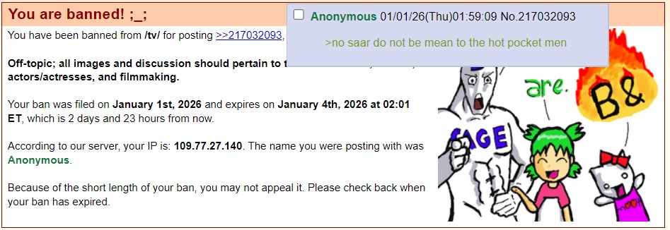 As predicted, leaving out "Starlet of /tv/" prevented the autodelete that seemed to be happening for the last day, so there seems to be something of a moratorium on that specific phrase. Of course we still had this dipshit >>220129 doing his same old schtick of badmouthing each and every part of a thread and crying about /co/, while no doubt spamming out those reports trying to lick the mods' boots some more.