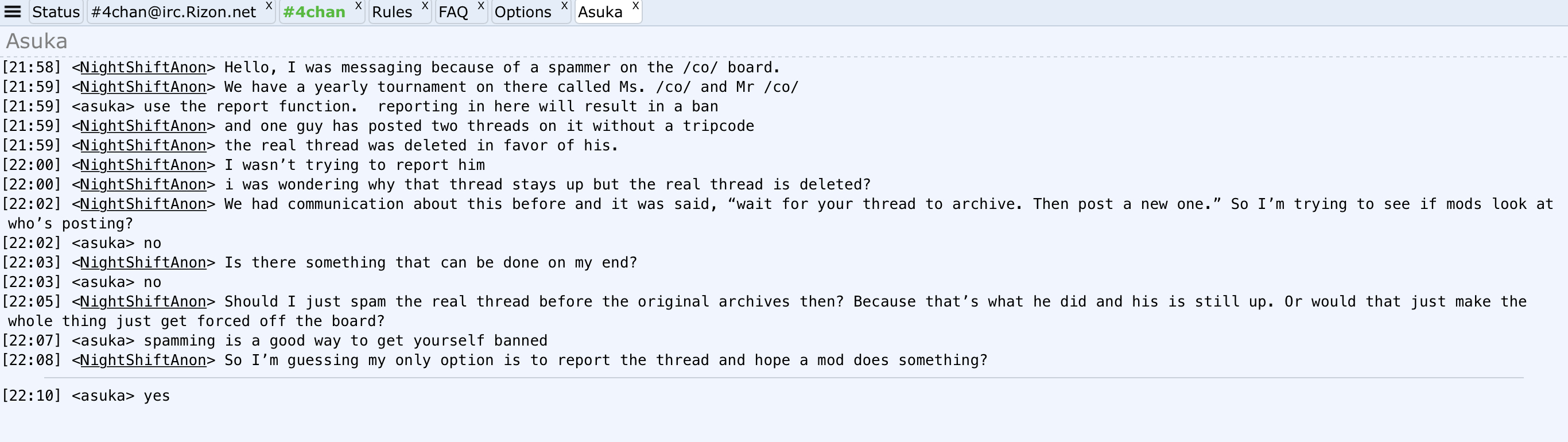 You get told to wait for the thread to archive. The board gets two spam threads before it archives.