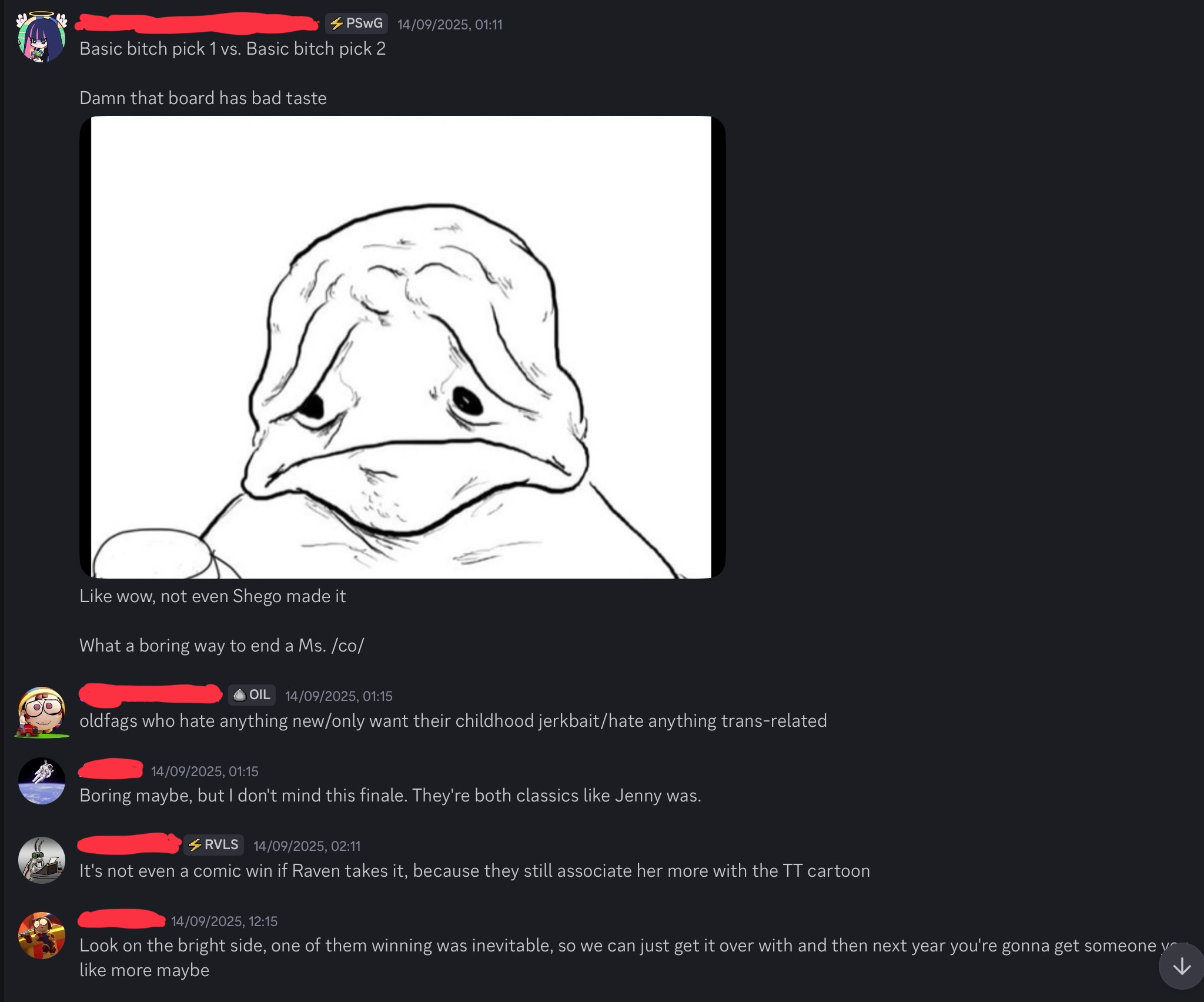 If you mean the conversation I brought up current thread, I was specifically only bringing up one particularly bad issue that likely wasn’t from them, at least originally. The “candidate” still sucked and some of the reactions to it losing out on Elite Eight to an actual character were embarrasing. You don’t need the tranny spam as ammo to criticize Propane, and the main reason that it got bunched in beyond timing was because of the aforementioned issues around Propane.