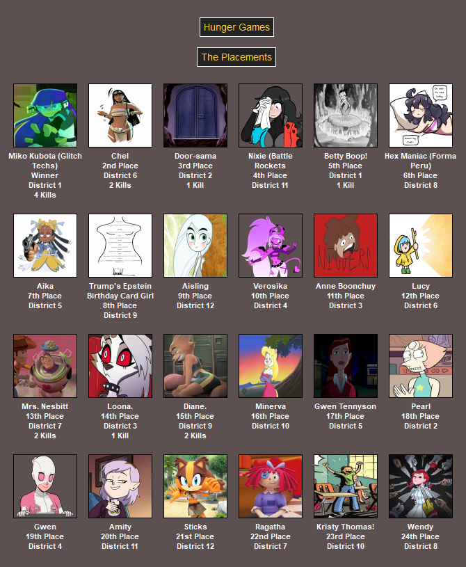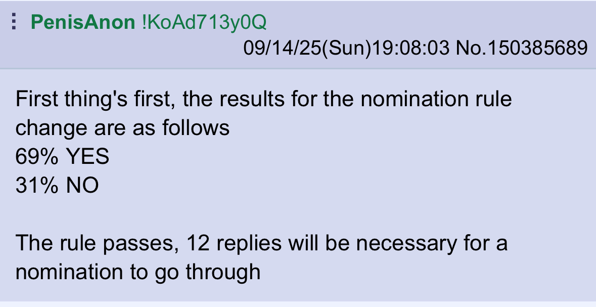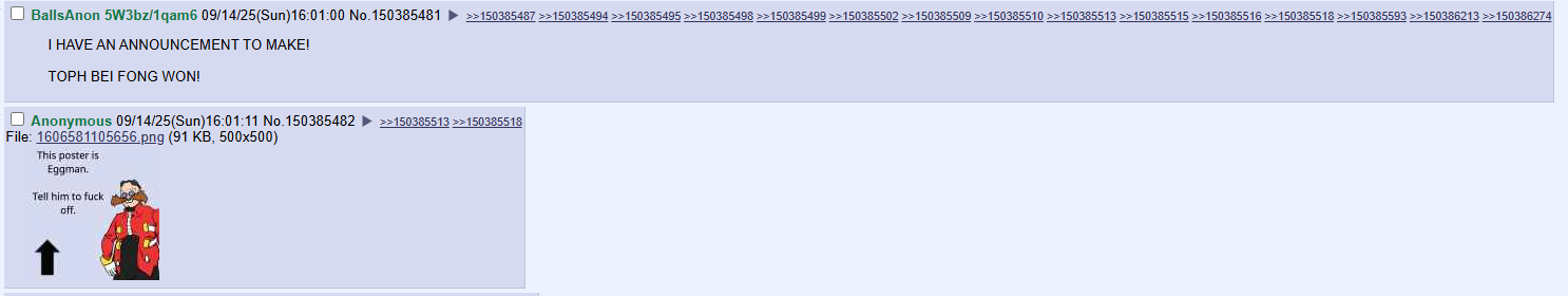 This board is for hosting tournaments and other organized competitions, be it either events, contests, or anything where a winner must be determined through votes or otherwise. Just for this board, image duplicates are enabled and the bump limits are set extra high. Roleplaying is encouraged, unless event hosts ask otherwise.