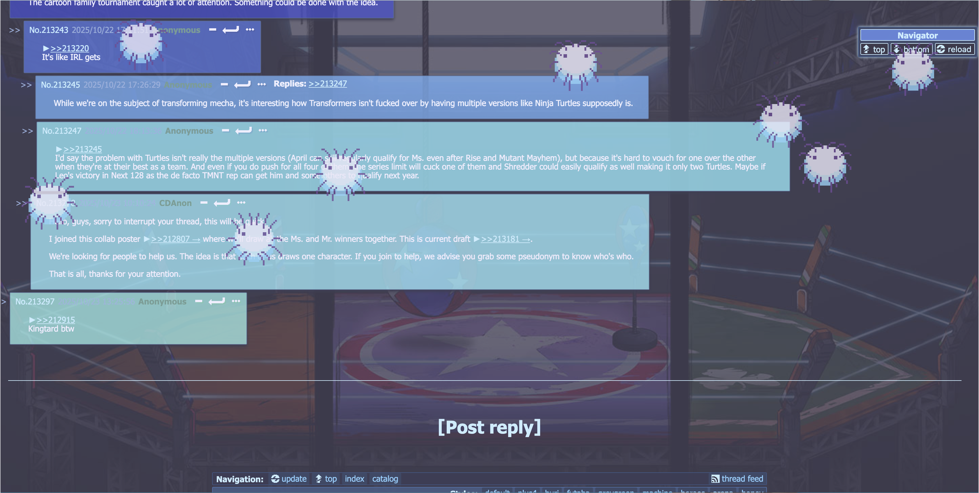 This board is for hosting tournaments and other organized competitions, be it either events, contests, or anything where a winner must be determined through votes or otherwise. Just for this board, image duplicates are enabled and the bump limits are set extra high. Roleplaying is encouraged, unless event hosts ask otherwise.