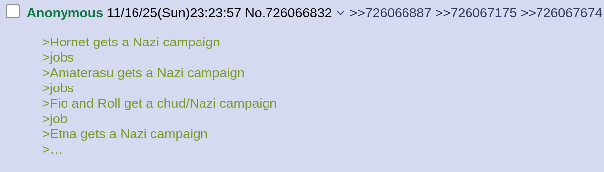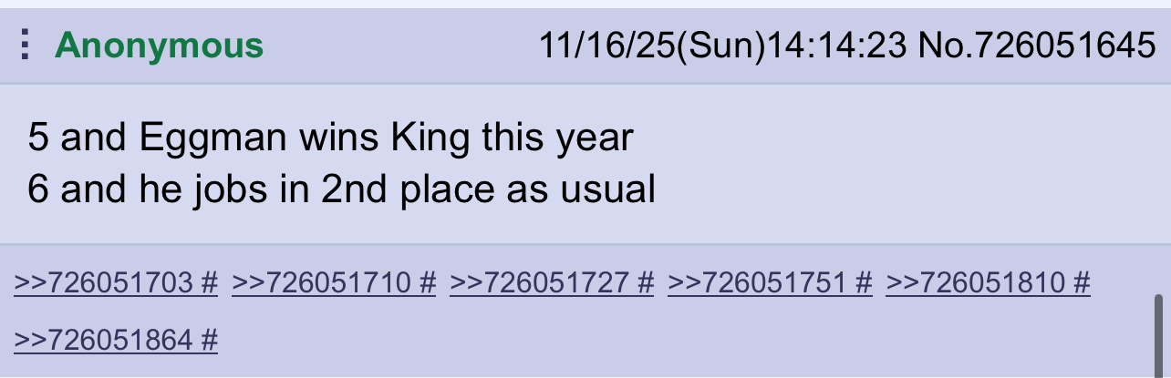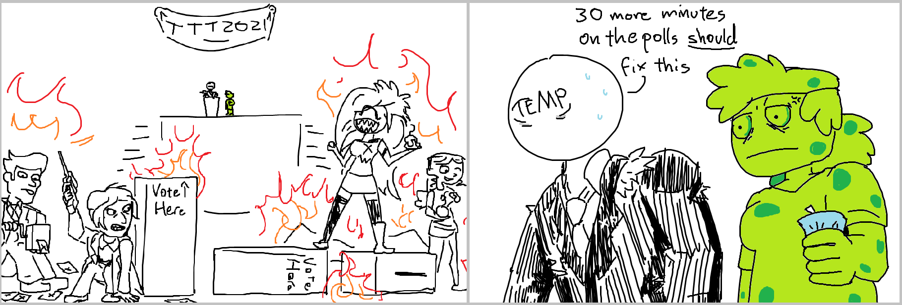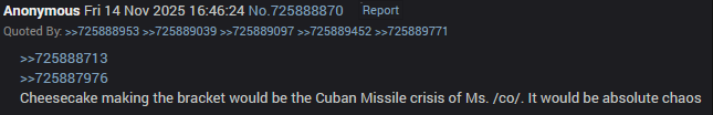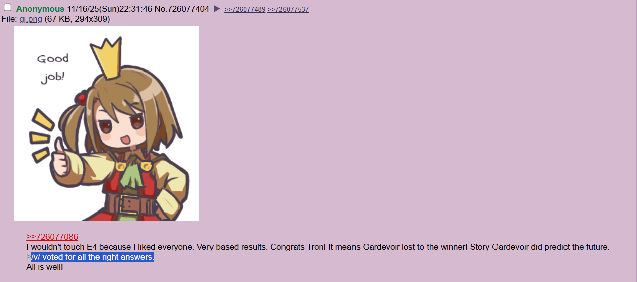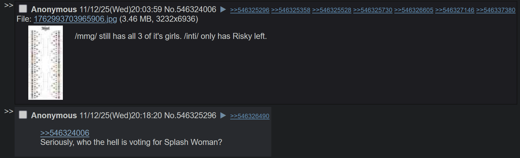 This board is for hosting tournaments and other organized competitions, be it either events, contests, or anything where a winner must be determined through votes or otherwise. Just for this board, image duplicates are enabled and the bump limits are set extra high. Roleplaying is encouraged, unless event hosts ask otherwise.