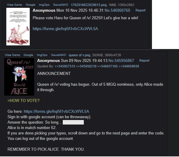 Dunno about you, but looking at the amount of votes we got this round (1300), I do believe there's something amiss here. The most votes Queen of /v/ got last year was 1171.