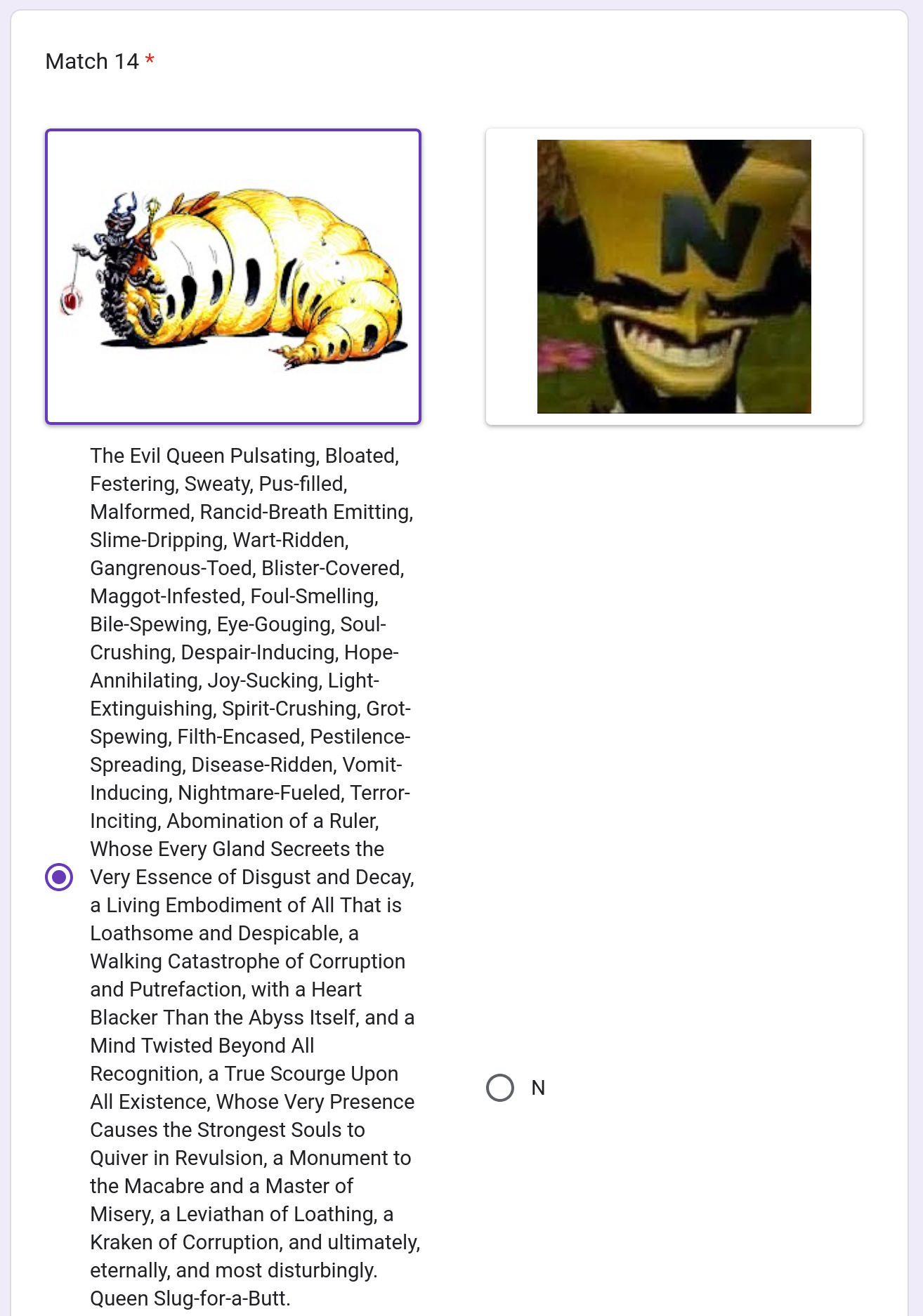 Nominating The Evil Queen Pulsating, Bloated, Festering, Sweaty, Pus-filled, Malformed, Rancid-Breath Emitting, Slime-Dripping, Wart-Ridden, Gangrenous-Toed, Blister-Covered, Maggot-Infested, Foul-Smelling, Bile-Spewing, Eye-Gouging, Soul-Crushing, Despair-Inducing, Hope-Annihilating, Joy-Sucking, Light-Extinguishing, Spirit-Crushing, Grot-Spewing, Filth-Encased, Pestilence-Spreading, Disease-Ridden, Vomit-Inducing, Nightmare-Fueled, Terror-Inciting, Abomination of a Ruler, Whose Every Gland Secreets the Very Essence of Disgust and Decay, a Living Embodiment of All That is Loathsome and Despicable, a Walking Catastrophe of Corruption and Putrefaction, with a Heart Blacker Than the Abyss Itself, and a Mind Twisted Beyond All Recognition, a True Scourge Upon All Existence, Whose Very Presence Causes the Strongest Souls to Quiver in Revulsion, a Monument to the Macabre and a Master of Misery, a Leviathan of Loathing, a Kraken of Corruption, and ultimately, eternally, and most disturbingly. Queen Slug-for-a-Butt.