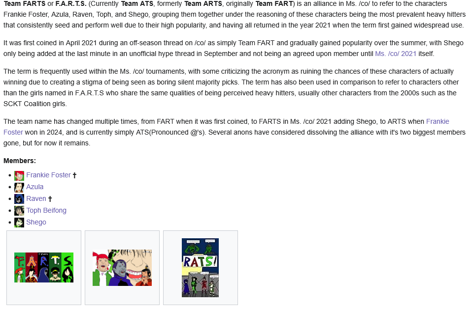 Mr. /co/'s main thing, alongside being by far the smallest major tournament, is that characters are pretty much set in their role where amount of effort put in does not usually matter post-nsa. Everyone is already cemented as an eternal borderline qualifying to Round 1 exit character, eternal round 1/2 character, eternal round 3/4 character, Round 4 to Elite 8 character, or always Elite 8 character. Characters rarely if ever vary from their set role of how they perform, regardless of OC or participation amount. Especially on the high end, we are running out of surprise characters who could make winning runs out of being new to E8 (and I think none of the remaining could win now).