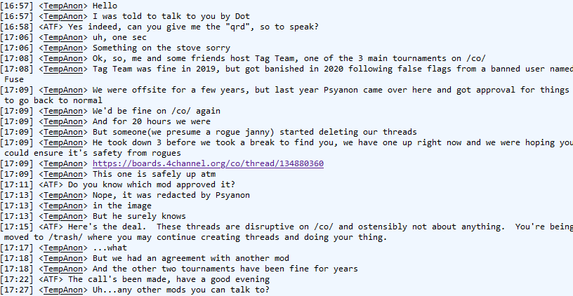 >If your tourney is deleted from the main site, mods can be appealed to through the 4chan irc. This has not been a necessity for the main tournaments in recent years as of this kit being written, and some widespread negative results have happened in the past from people attempting to contact them about a deleted side tourney. As such I do not personally recommend it. If you have to, host the deleted tourney on /tnt/. If you are going to contact mods then be extremely cautious and courteous, with a prepared and reasoned statement on the matter.