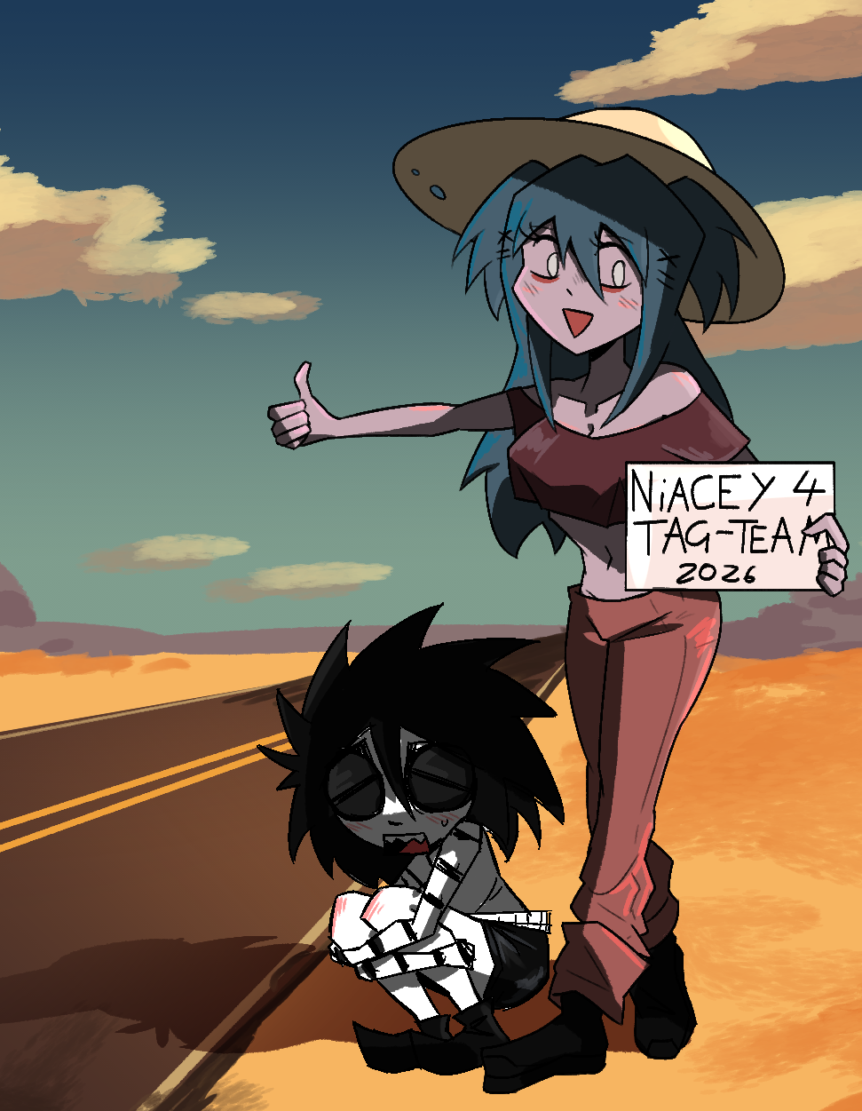Well, he ain't chewin' me bones yet so I guess I'll give this tag teamup a go. If I catch him eyein' up me leg bones I'm hightailin' it out of here. Mandy may be cruel and sadistic but she never buried me alive... much.