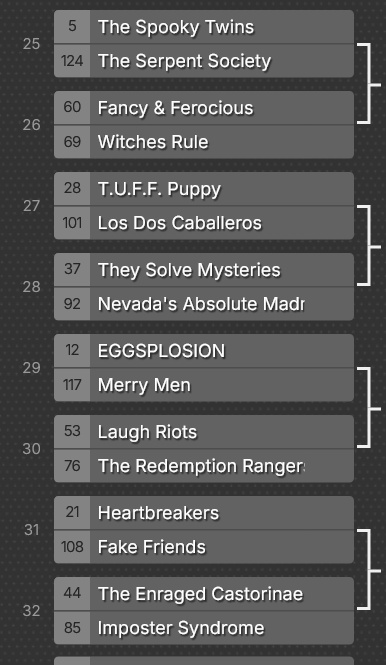 Kind of expected all of them to lose. Frollo is a team that needs the campaigner around. Come to think of it any non-canon teams need a campaigner to really make them work cause they're not self-evident in the same way a normal team is. Witches Rule sort of felt like this years Niacey. It's fine to have one or a few eclectic picks in E8.