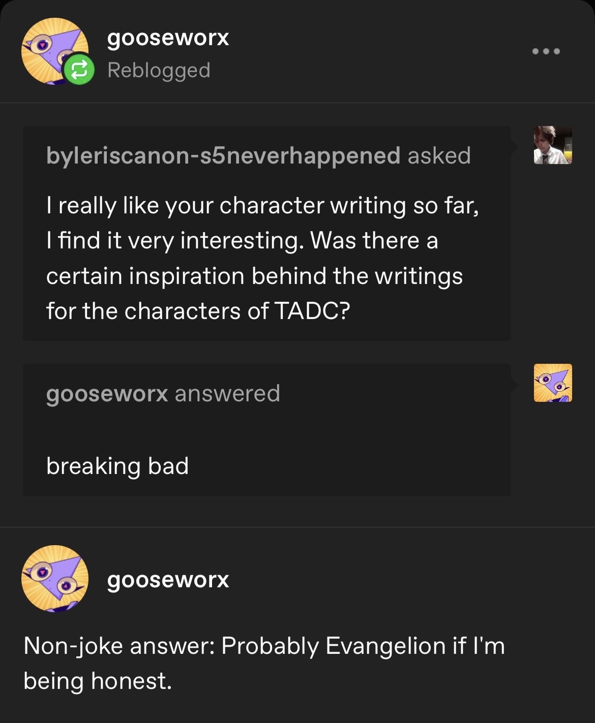 I don't think any of Glitch's upcoming shows scratch that autism itch that TADC does. Maybe Gameoverse will come close. Mel didn't come close to qualifying, but if Gaslight and KoG have their second episodes out by then I can see a few making it in. Mel, Gwen, maybe Frankie?