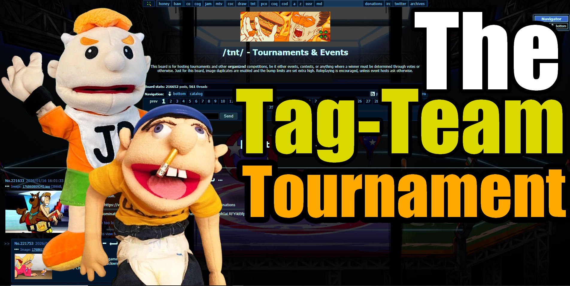 This board is for hosting tournaments and other organized competitions, be it either events, contests, or anything where a winner must be determined through votes or otherwise. Just for this board, image duplicates are enabled and the bump limits are set extra high. Roleplaying is encouraged, unless event hosts ask otherwise.