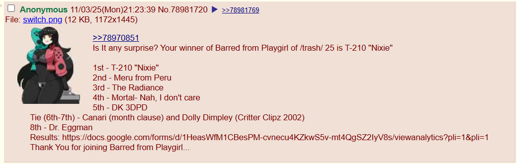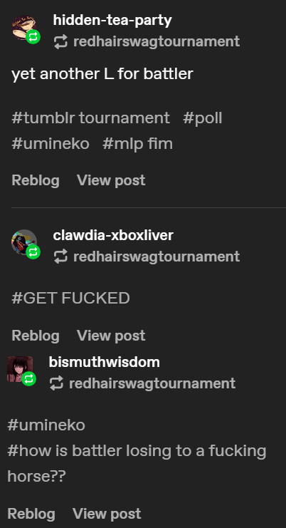 This board is for hosting tournaments and other organized competitions, be it either events, contests, or anything where a winner must be determined through votes or otherwise. Just for this board, image duplicates are enabled and the bump limits are set extra high. Roleplaying is encouraged, unless event hosts ask otherwise.