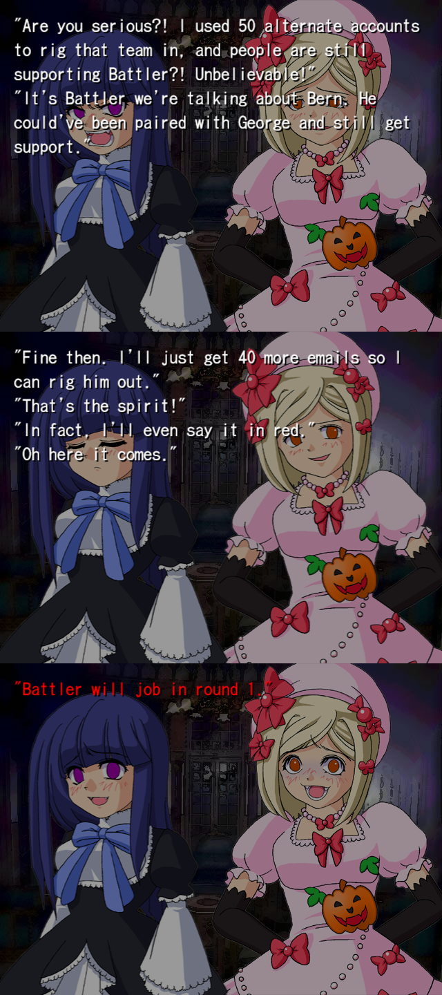 Battler once again exists being very funny to vote for and against, endless dimes either way. However Battler x Cuck nomination managed to weaponize the Jobbler crowd, clever play.