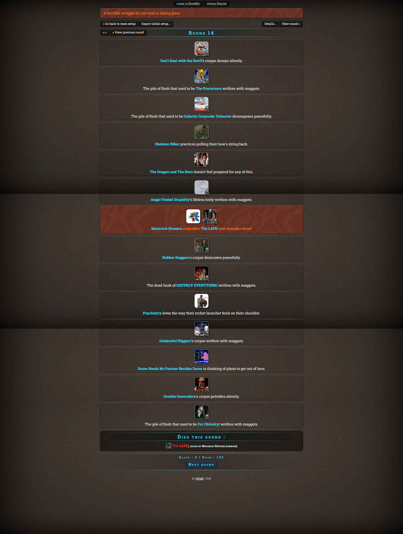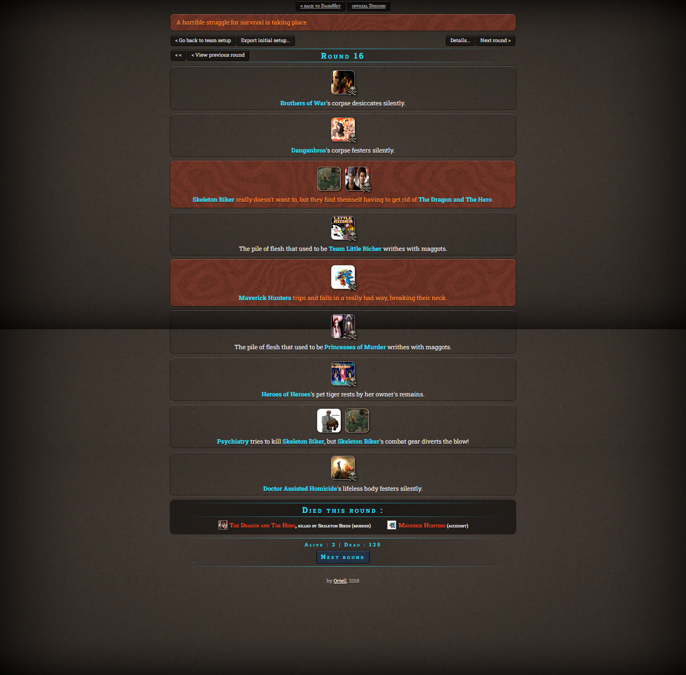 Welcome all to the Murder Games! The purpose of this tournament is to give any of your nominee a second chance to get a win. For each character added to this tournament, the game randomly gives them perks and items that will come in handy, although other times can backfire horribly. The game is simple, everything is a simulation where all the characters fight each other to death. The rules are simple: