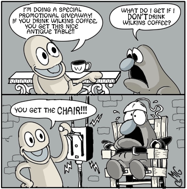>I don't even know how Wilkins came back. He just showed up at my door one day with a Purple Haired chick and some dyke trying to sell me more Wilkins Coffee and get me back on the squad.