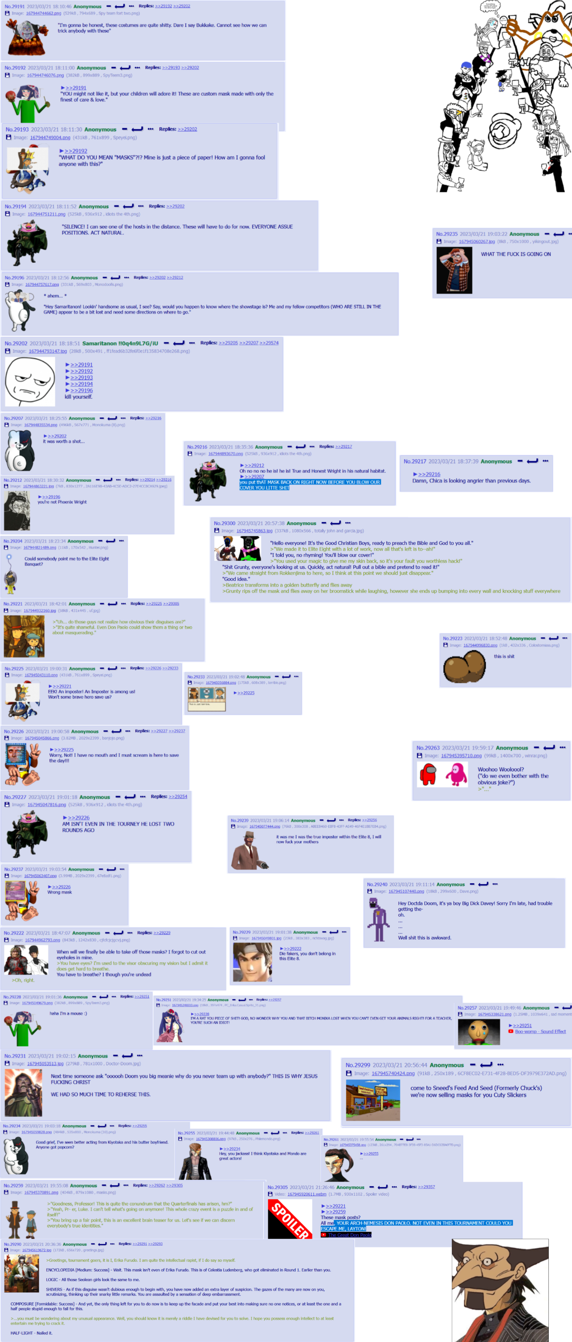 This board is for hosting tournaments and other organized competitions, be it either events, contests, or anything where a winner must be determined through votes or otherwise. Just for this board, image duplicates are enabled and the bump limits are set extra high. Roleplaying is encouraged, unless event hosts ask otherwise.