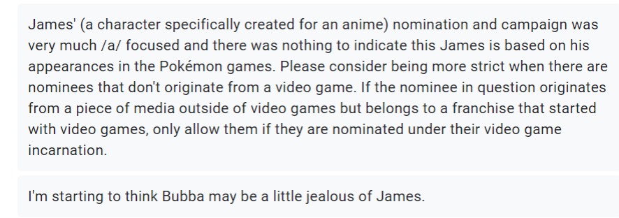 I feel bad for the James anon. 8th still is definitely something to write home about, but it feels like James only fell because of the "James isn't videogames" debacle in Elite Eight. This comes off as really hypocritical after how far AM got to go but then again, I heard people were seething about him too at the end of King. Why can't we just enjoy things?